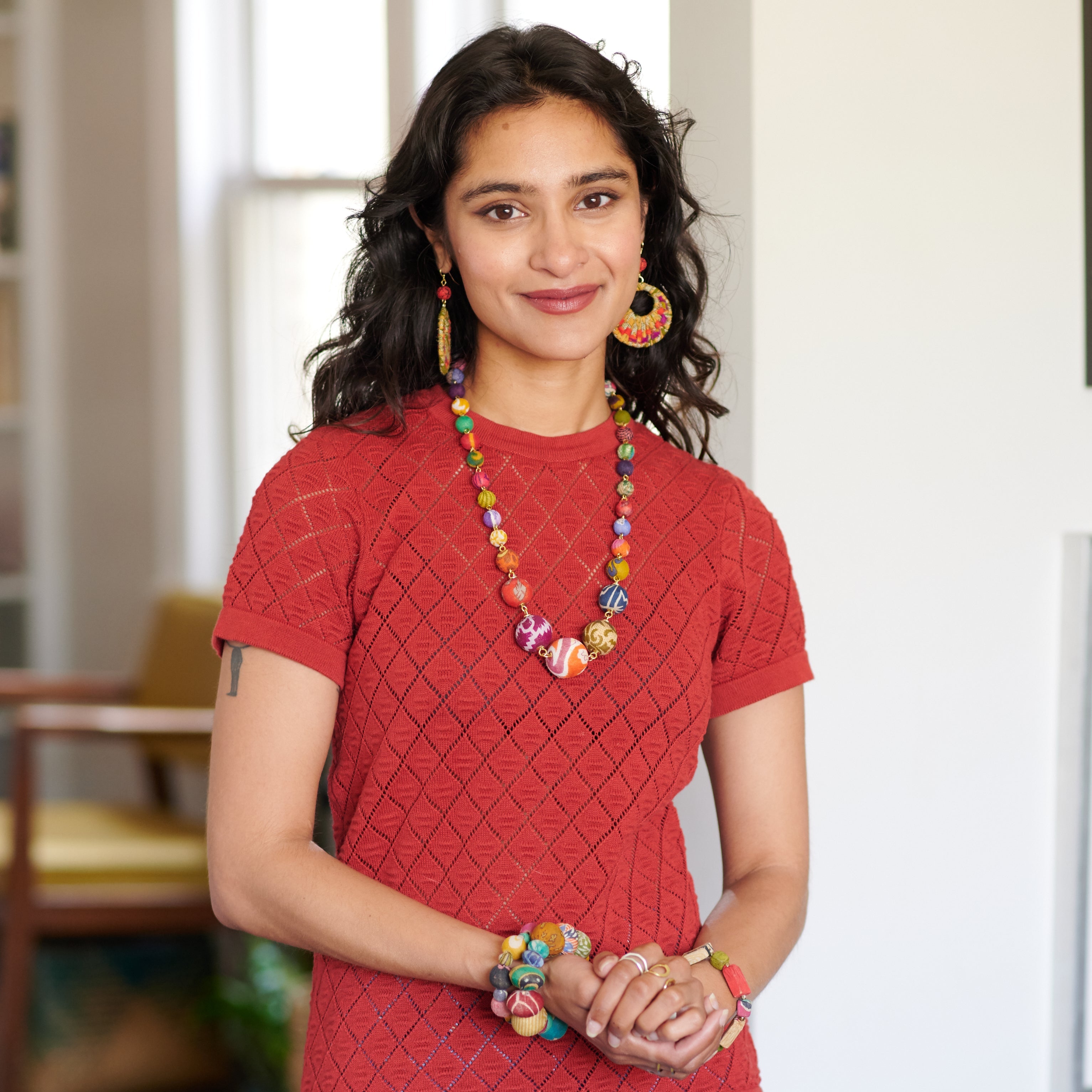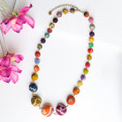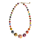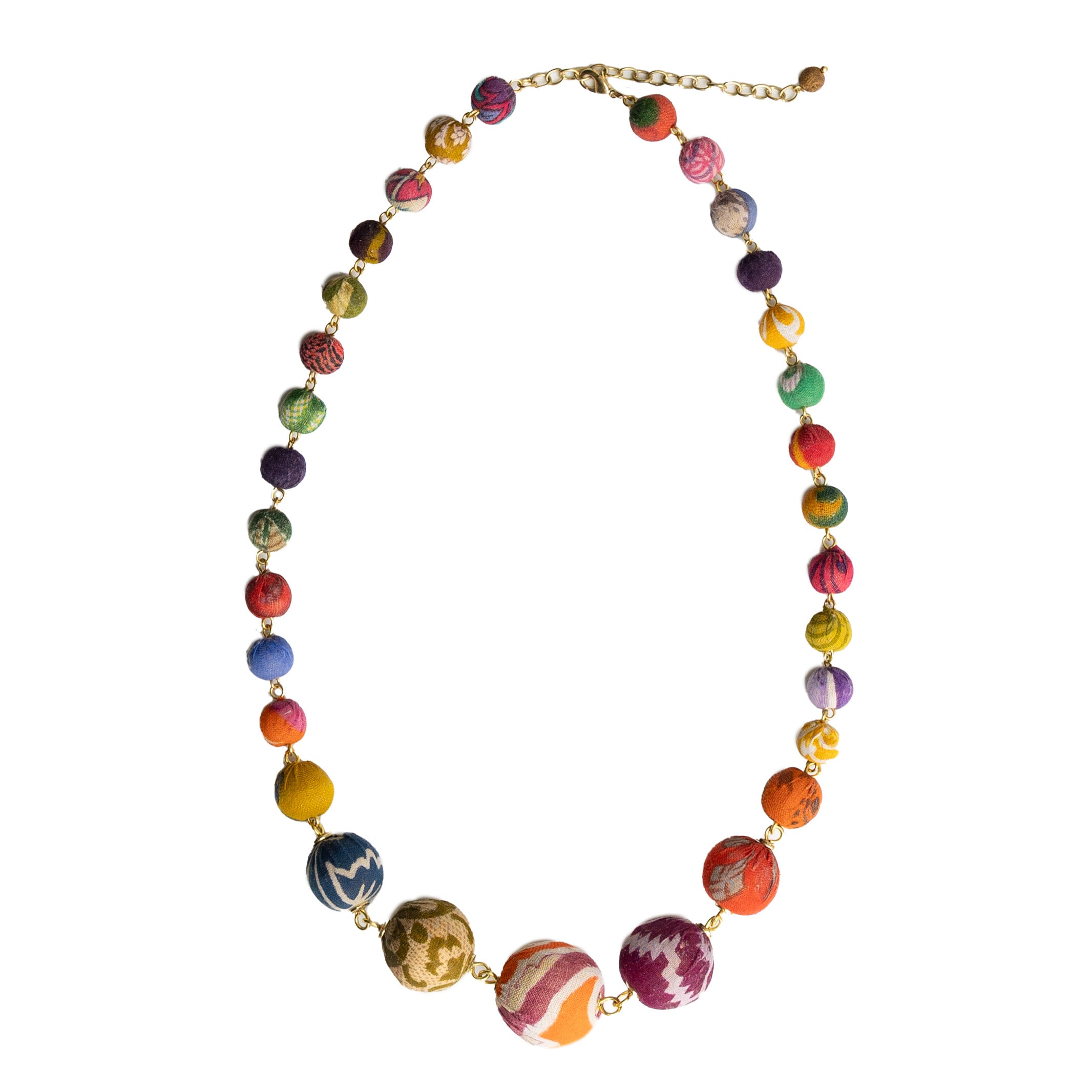 This favorite silhouette features round Kantha beads that graduate larger toward the center, and then taper going up towards the clasp. The colorful beads are linked together with brass wire to create a super fluid style.