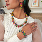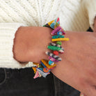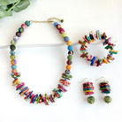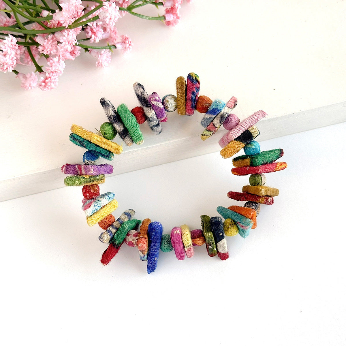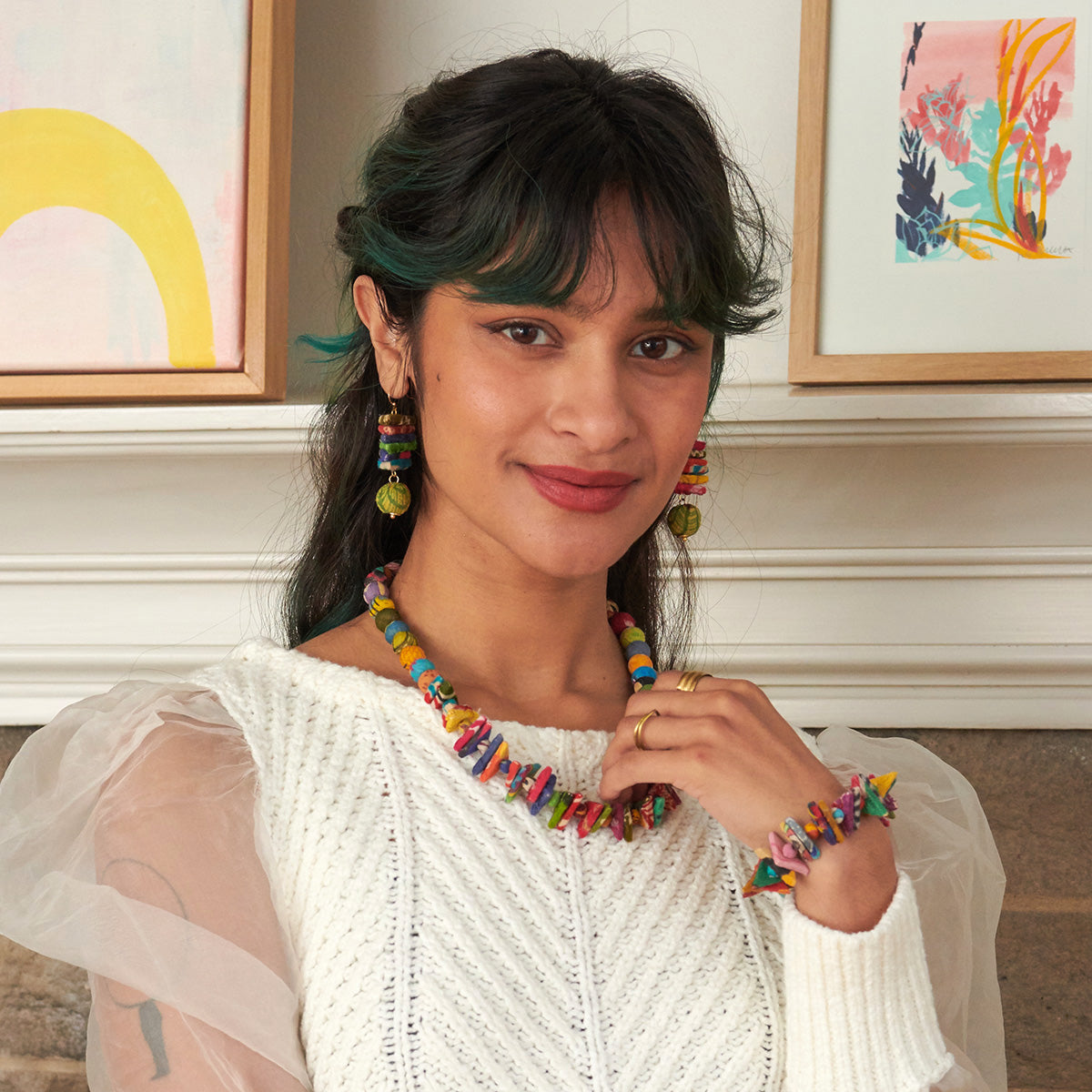 Colorful, unique triangle-shaped Kantha beads are paired up and separated by traditional round beads to form this geometric statement style. It’s a gorgeous combination of colors, patterns, shapes and textures. Crafted from repurposed Sari and Kantha fabric, the colorful beads are all one-of-a-kind.