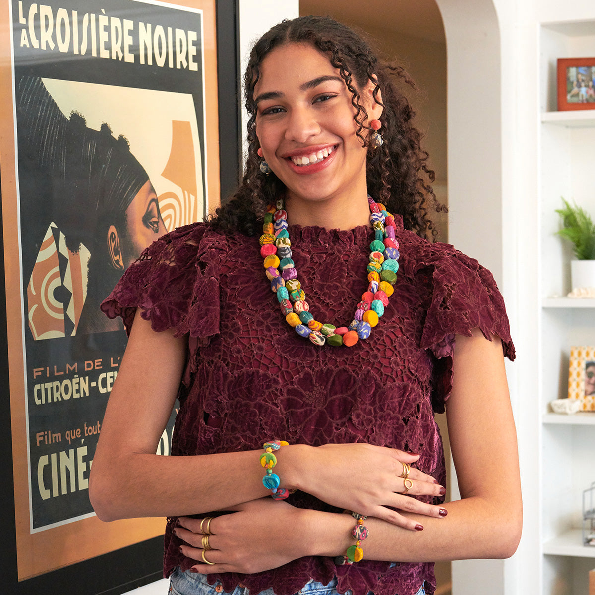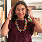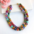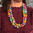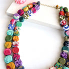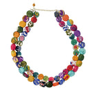 Colorful Kantha covered disc-shaped beads create this textured, double-strand statement style. Inspired by our favorite colorful hard candies, it’s guaranteed to turn heads! It effortlessly styles with both casual and dressy looks, and is an incredible mix of color, shape and texture. Crafted from repurposed Sari and Kantha fabric, each is one-of-a-kind and exact colors will vary.
