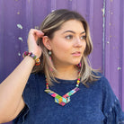 Thirteen diamond-shaped Kantha beads are artfully arranged to form the center portion of this unique statement necklace. Reminiscent of stained glass, the colorful mosaic centerpiece is backed in black cotton, and connected to a chain of round Kantha beads. As the beads are handmade from repurposed Sari and Kantha textiles, each necklace is slightly different.