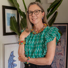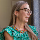 A strand of small Kantha beads traces and wraps around to frame a strand of large Kantha beads and create this structured-but-flexible collar necklace silhouette. It looks great styled with casual tops and tees and adds an elevating pop of color to special occasion dresses too.
