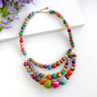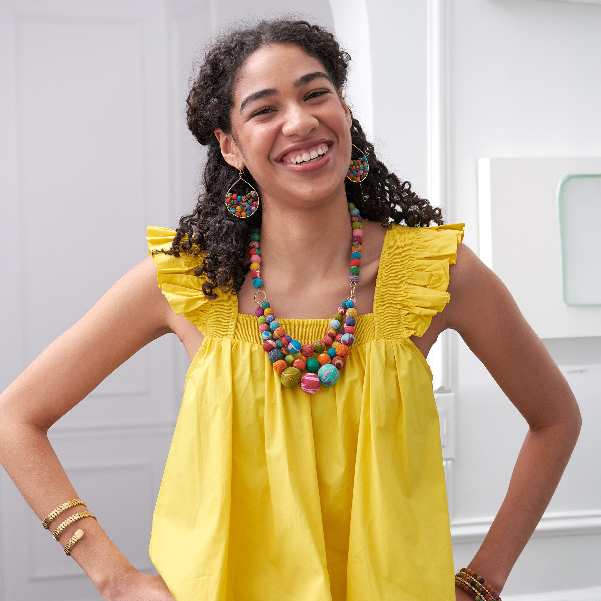 Three strands of graduated Kantha beads form the centerpiece of this style, connect to a textured brass ring and then to a strand of smaller round Kantha beads to complete the silhouette. This statement style brings so much color and texture to every outfit. Crafted from reclaimed Sari and Kantha textiles, each will vary slightly.