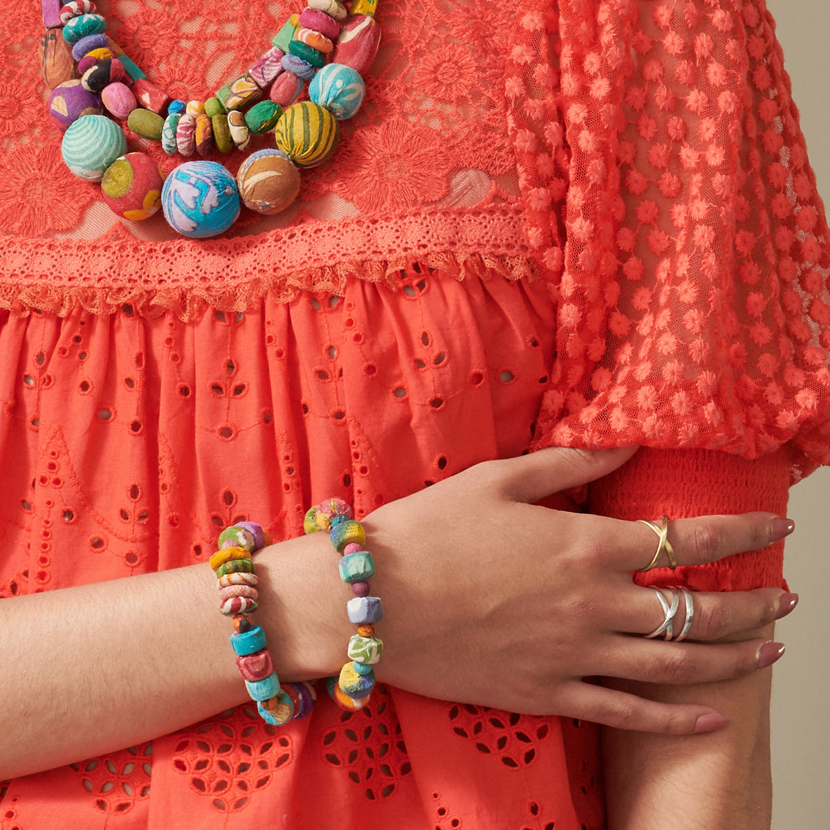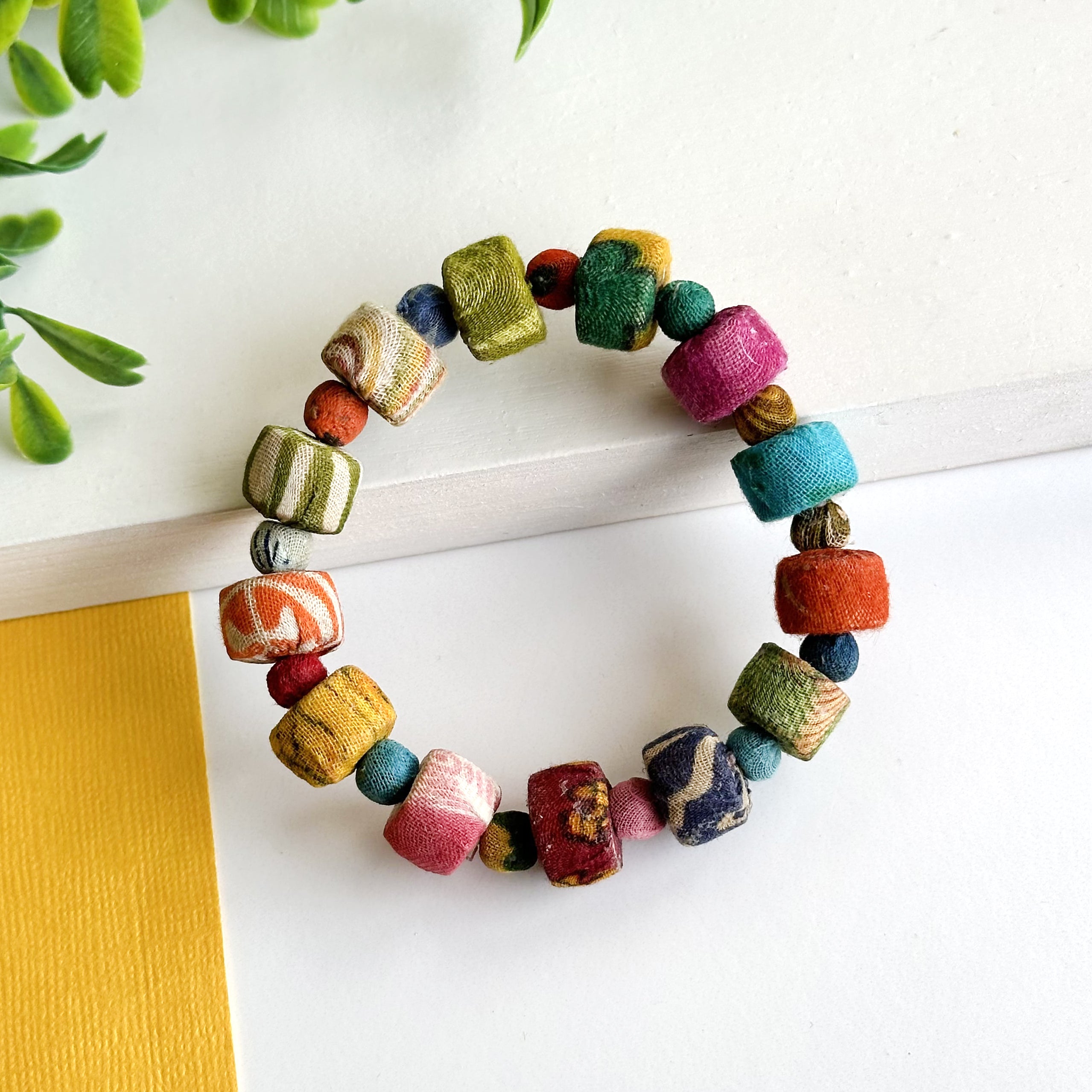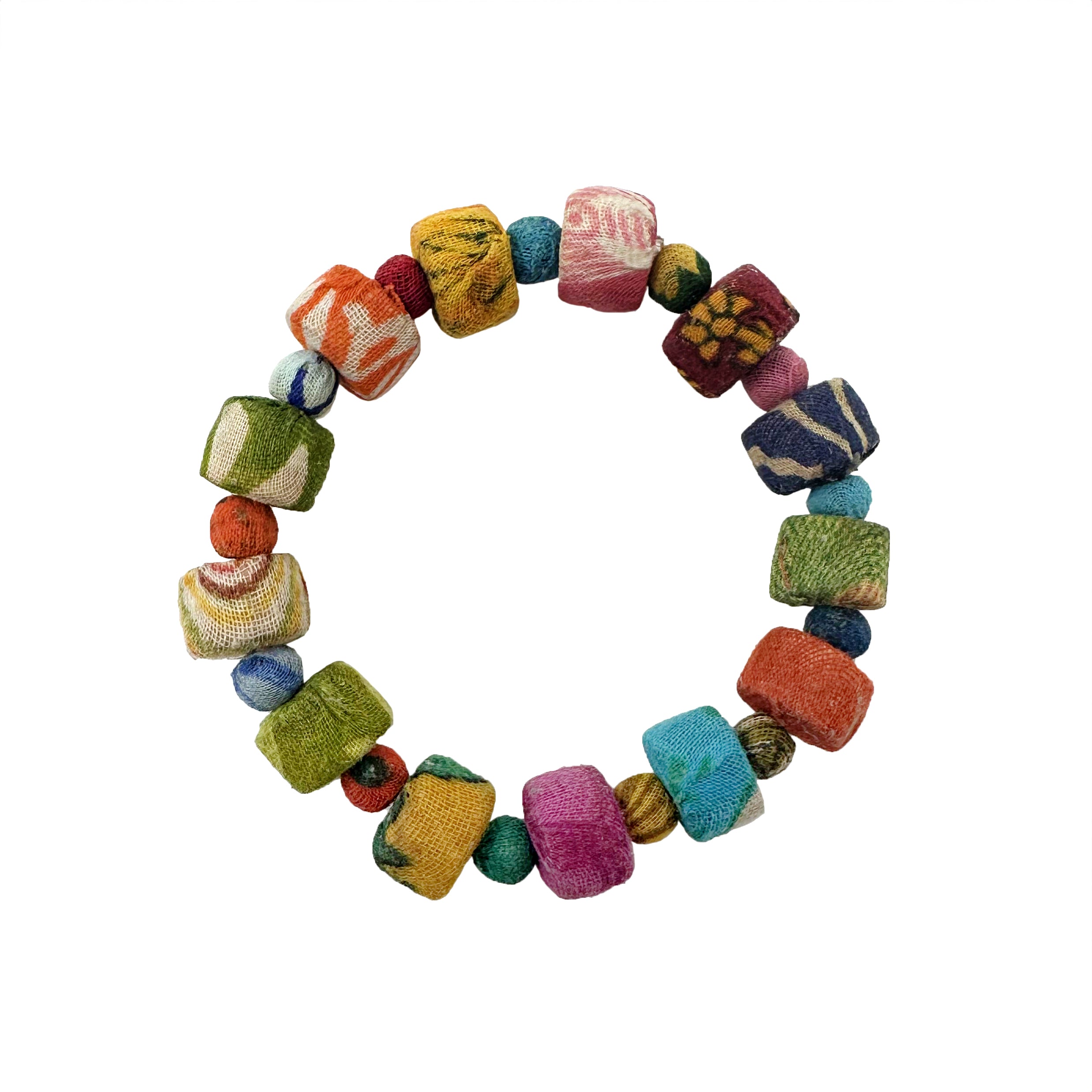 Unique wheel-shaped Kantha beads alternate with round beads to create this unique stretchy strand. It easily rolls on and off and makes a subtle statement! Crafted from repurposed Kantha textiles, the colors and patterns will vary slightly.