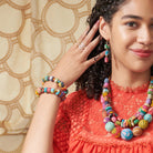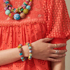 Bracelet measures 6.5" in circumference; stretches to fit most. Beads measure 0.5" at widest.