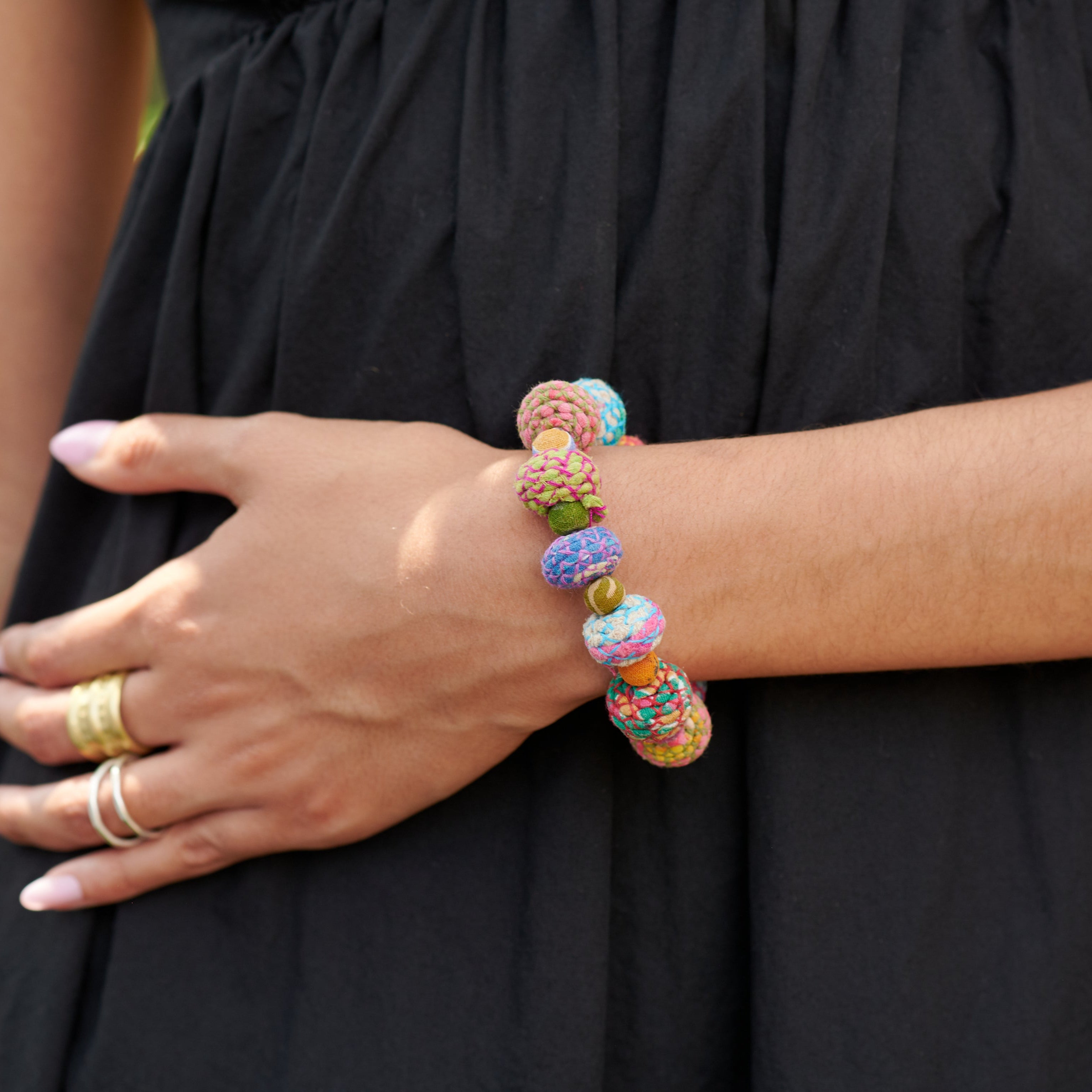 A fresh take on our Kantha Jewelry, the Threaded Kantha Collection features a colorful, textured wrap technique. The artisans first cut the repurposed Kantha fabric into long strips, wrap them with colorful cotton thread, and then cover oval-shaped beads with the textured strips. The Kantha and thread-wrapped beads are incredibly colorful, and are interspersed with traditional round Kantha beads to form the Bauble Bracelet.
