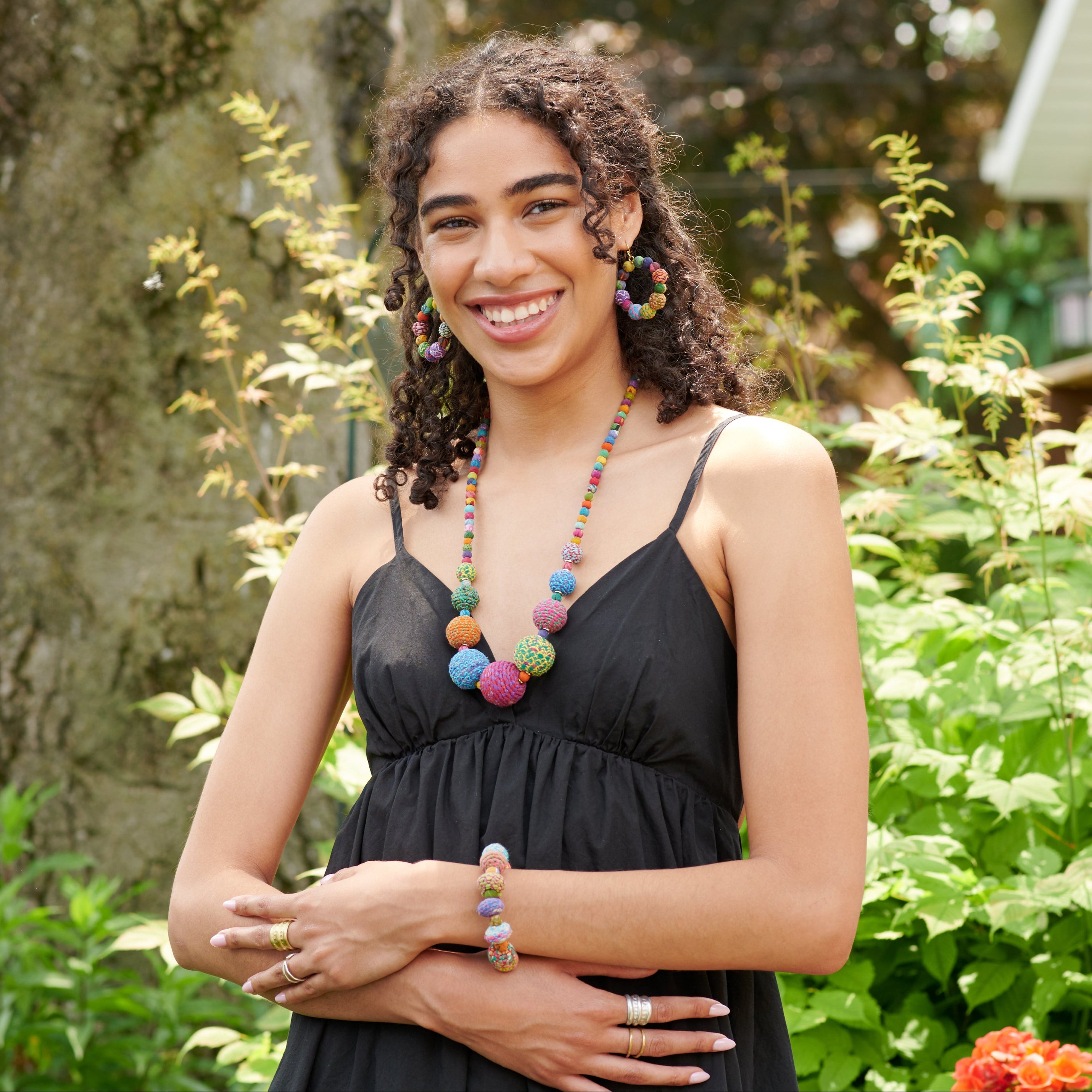 A fresh take on our Kantha Jewelry, the Threaded Kantha Collection features a new colorful, textured wrap technique. The artisans first cut the repurposed Kantha fabric into long strips, wrap them with colorful cotton thread, and then cover round-shaped beads with the textured strips. The Kantha and thread-wrapped beads are incredibly colorful, and eight graduated beads are interspersed with traditional Kantha fabric beads to form the Threaded Kantha Graduated Necklace. It’s a lovely, textured statement piece that easily styles with anything and everything.