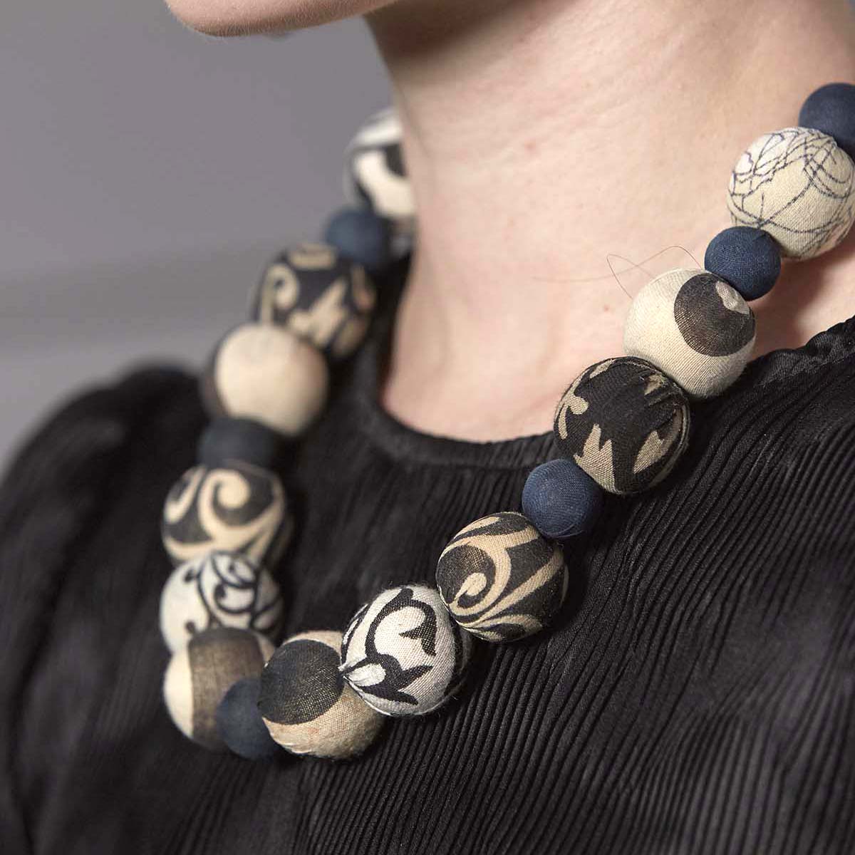 Alternating groups of medium and large Kantha textile beads form a simple but statement-making collar style necklace. The larger beads are in black and white, while the smaller beads are Indigo. Made from repurposed Kantha textiles; patterns will vary.