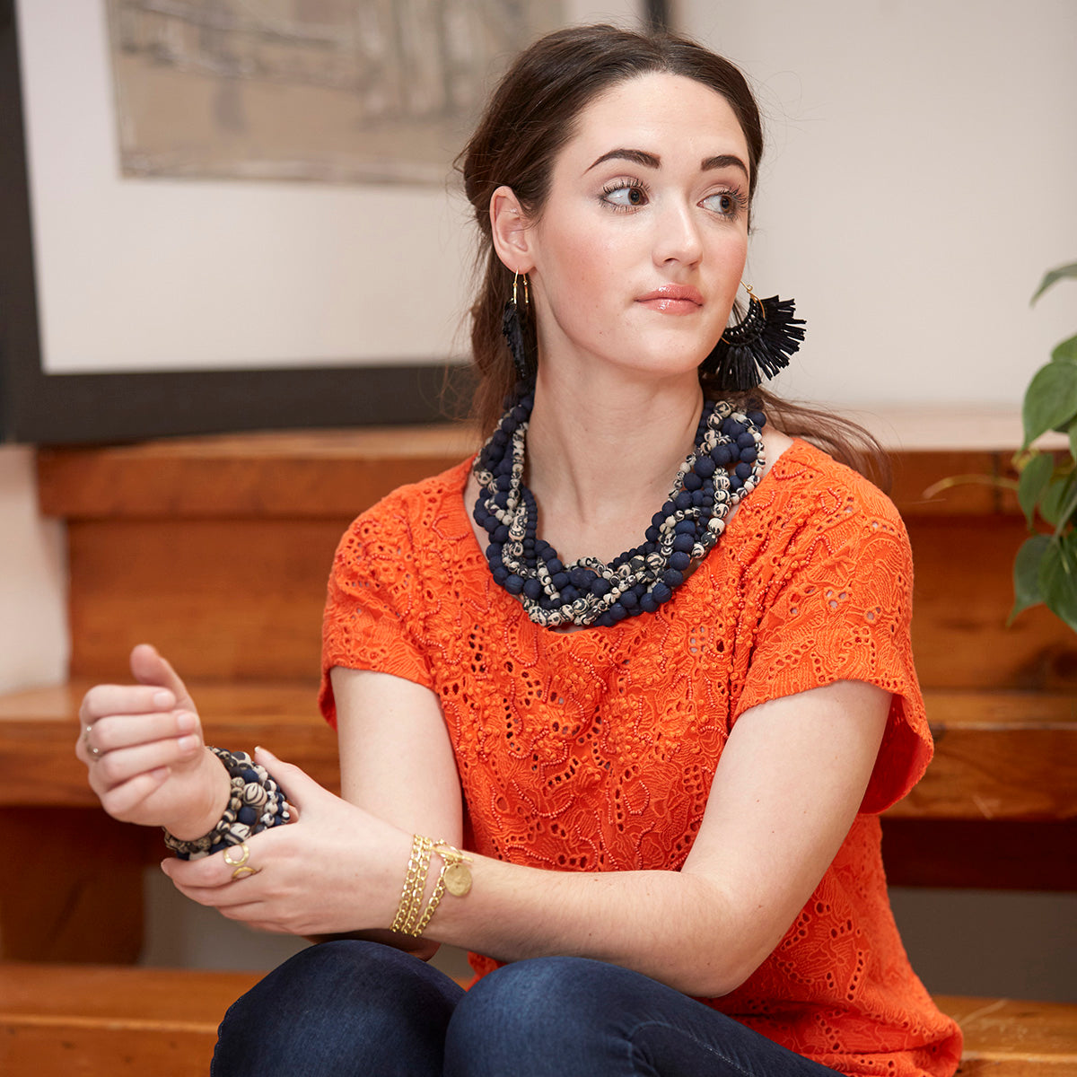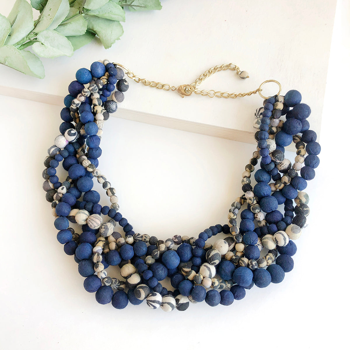 A sophisticated take on our repurposed textile jewelry. Strands of beads in deep indigo blue join neutral strands in black and white, and are then braided into this amazing statement necklace.