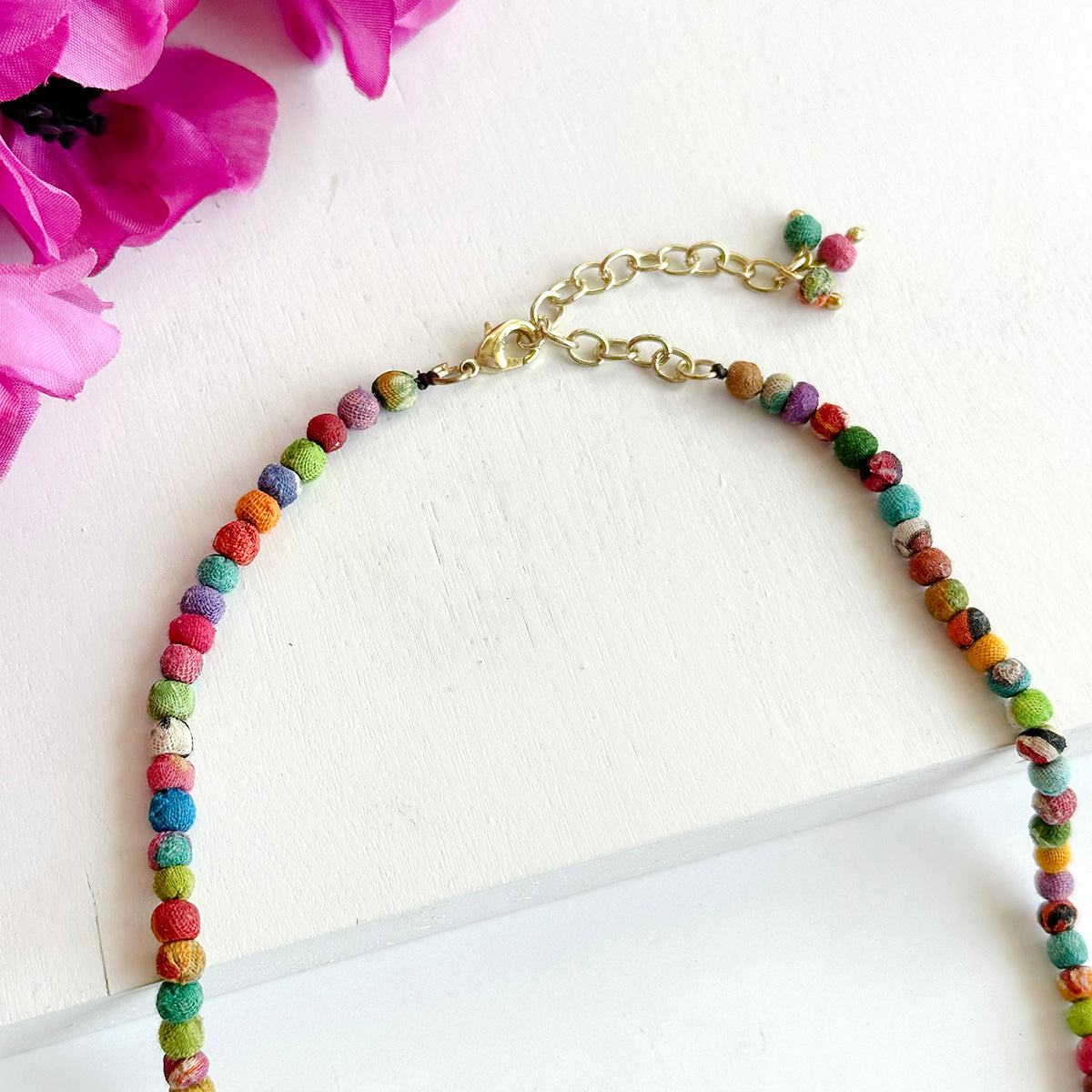 Teeny tiny Kantha beads form this candy-colored strand that looks great alone or layered. The Kantha Milieu Classic Necklace has our smallest Kantha beads yet! Each bead is crafted from repurposed Sari and Kantha textiles so exact colors will vary.