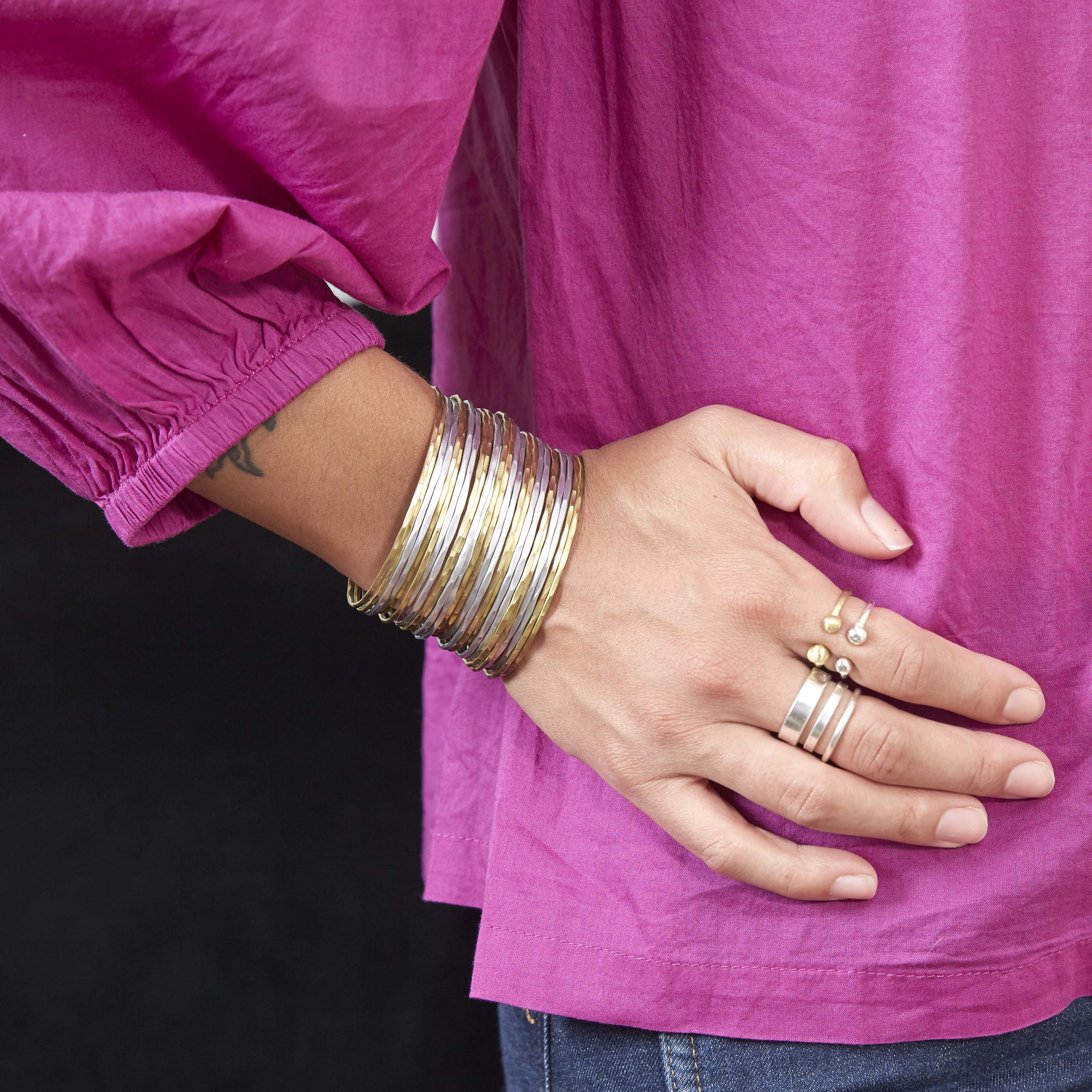Delicate gold and silver bands layer to construct this style. With 26 bands joined around a base of wire, this metallic bracelet is a stunning statement piece.