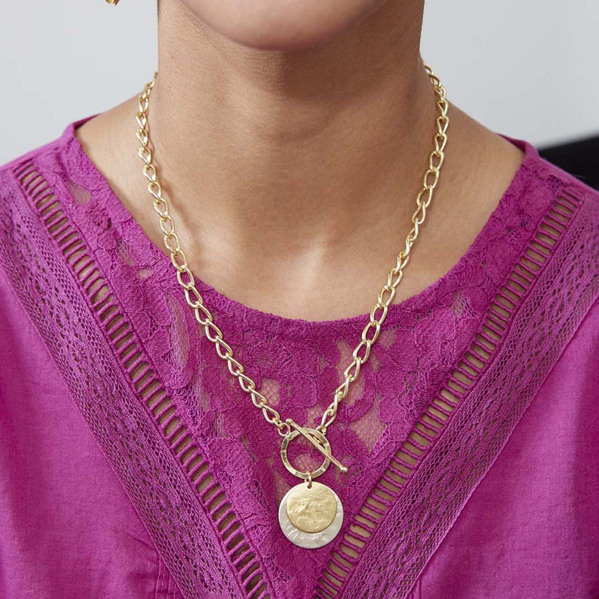 Matte textured discs in gold and silver metal drop from a classic gold chain with a front toggle closure.