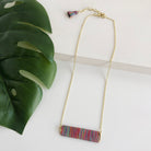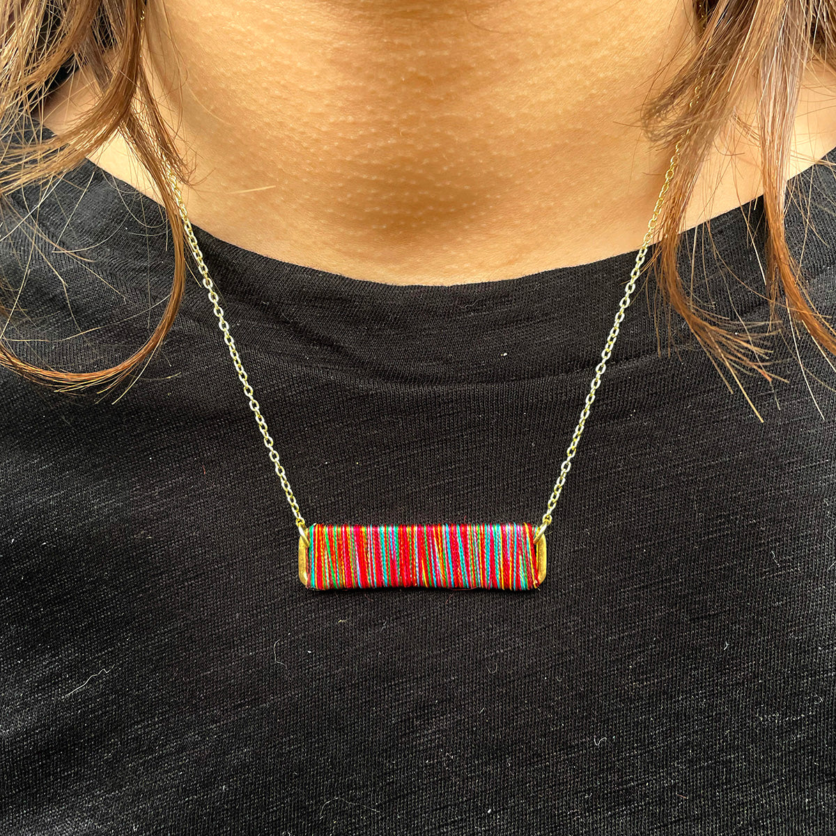 This rectangular pendant necklace features colorful rainbow threads, wrapped and woven around a brass base. Part of our Raja Rainbow collection.