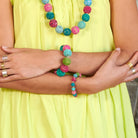 A fresh take on our Kantha Jewelry, the Threaded Kantha Bloom Collection features a colorized, textured wrap technique. The artisans first sort the repurposed Kantha fabric into rich shades of teal, cerise, and lime green, then cut the fabric into long strips, wrap them with colorful cotton thread, and then cover beads with the textured strips. The small Kantha thread-wrapped beads are incredibly colorful, and are interspersed with metallic gold beads. This bracelet is incredibly textured and makes a beautiful delicate piece.