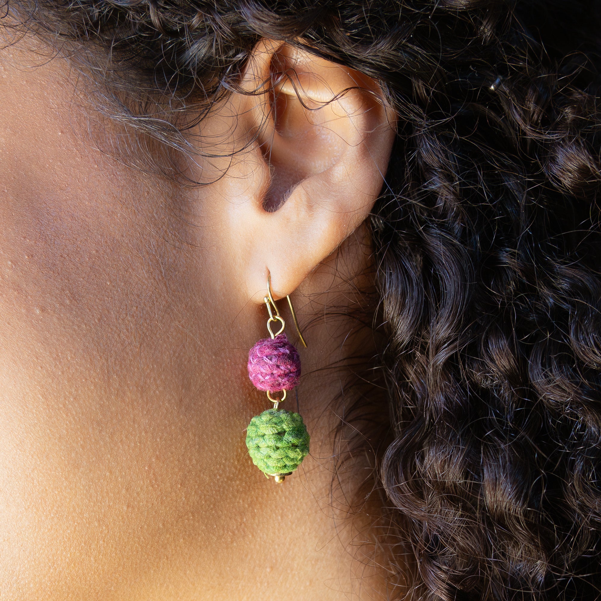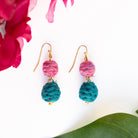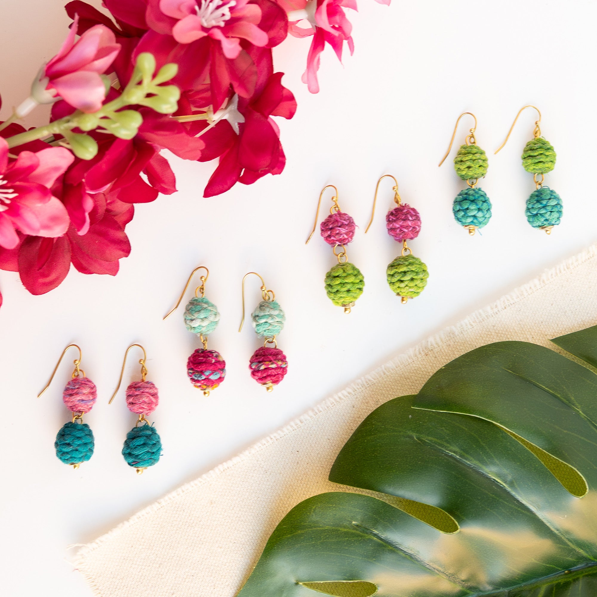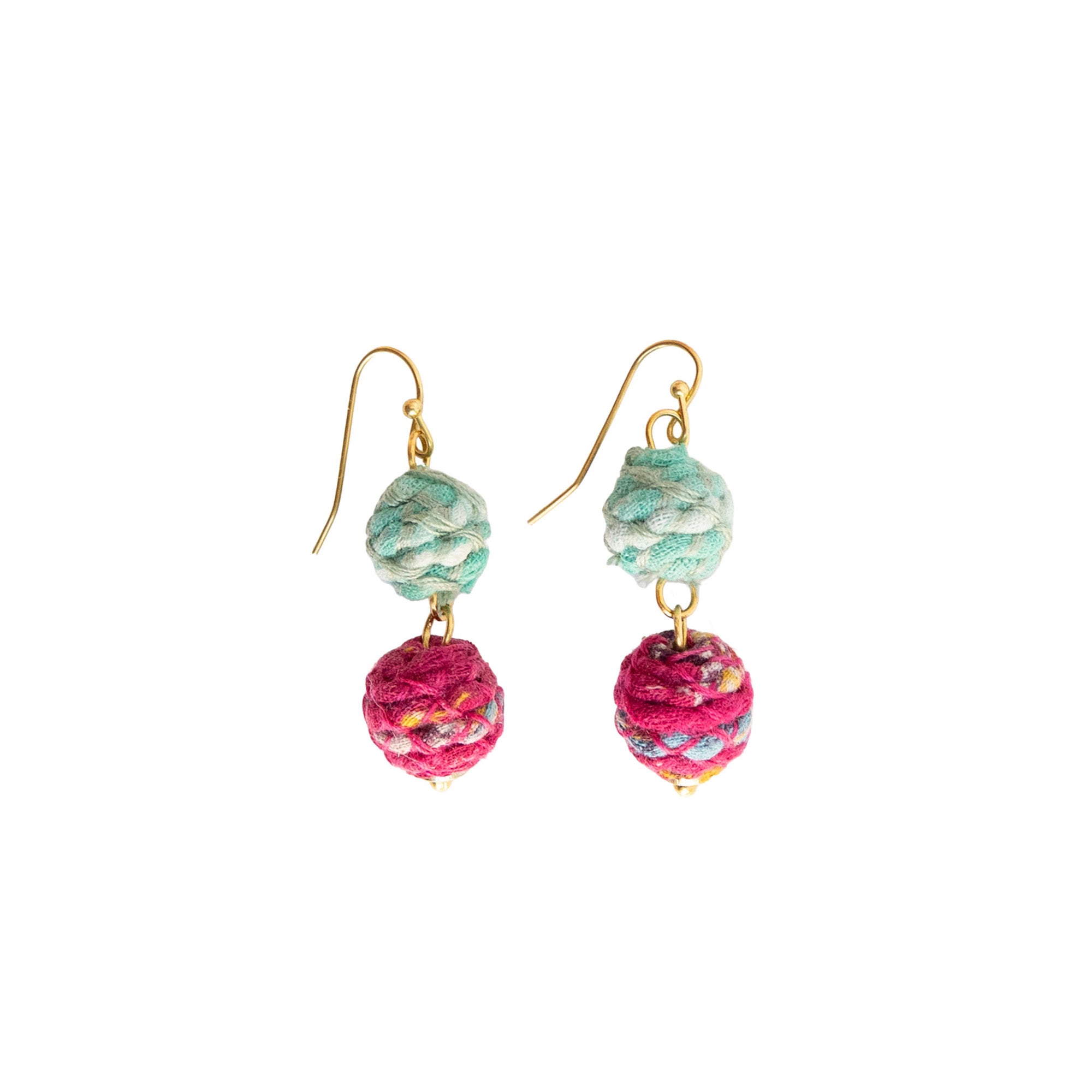 A fresh take on our Kantha Jewelry, the Threaded Kantha Bloom Collection features a colorized, textured wrap technique. The artisans first sort the repurposed Kantha fabric into rich shades of teal, cerise, and lime green, then cut the fabric into long strips, wrap them with colorful cotton thread, and then cover beads with the textured strips. Two small Kantha thread-wrapped beads are paired together to form this delicate, yet fluid silhouette.