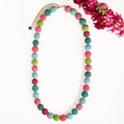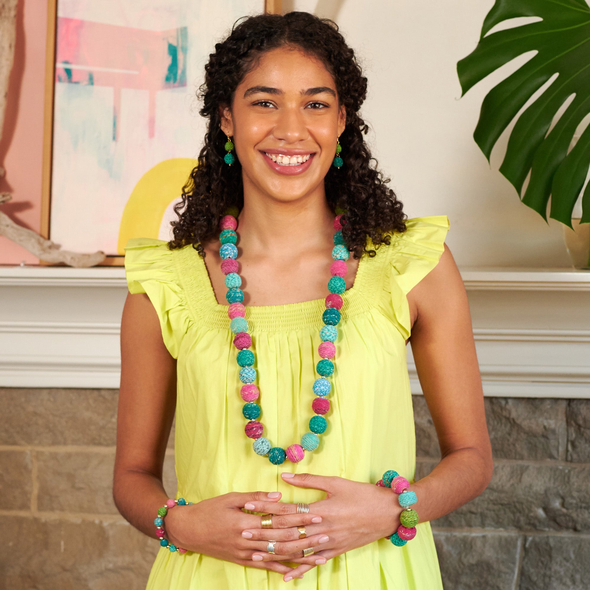 A fresh take on our Kantha Jewelry, the Threaded Kantha Bloom Collection features a colorized, textured wrap technique. The artisans first sort the repurposed Kantha fabric into rich shades of teal, cerise, and lime green, then cut the fabric into long strips, wrap them with colorful cotton thread, and then cover beads with the textured strips. This necklace is incredibly textured, super fluid, and makes a beautiful statement.