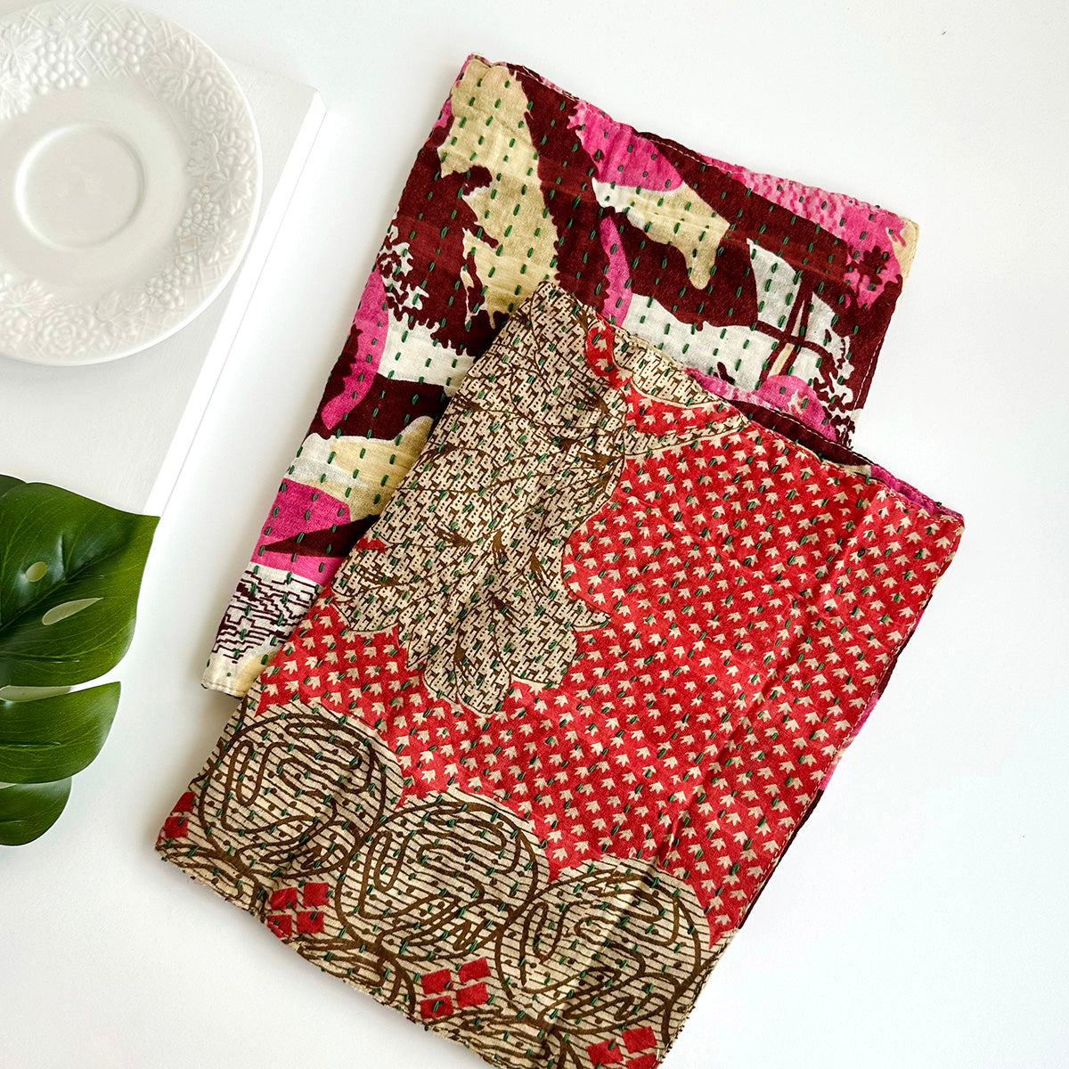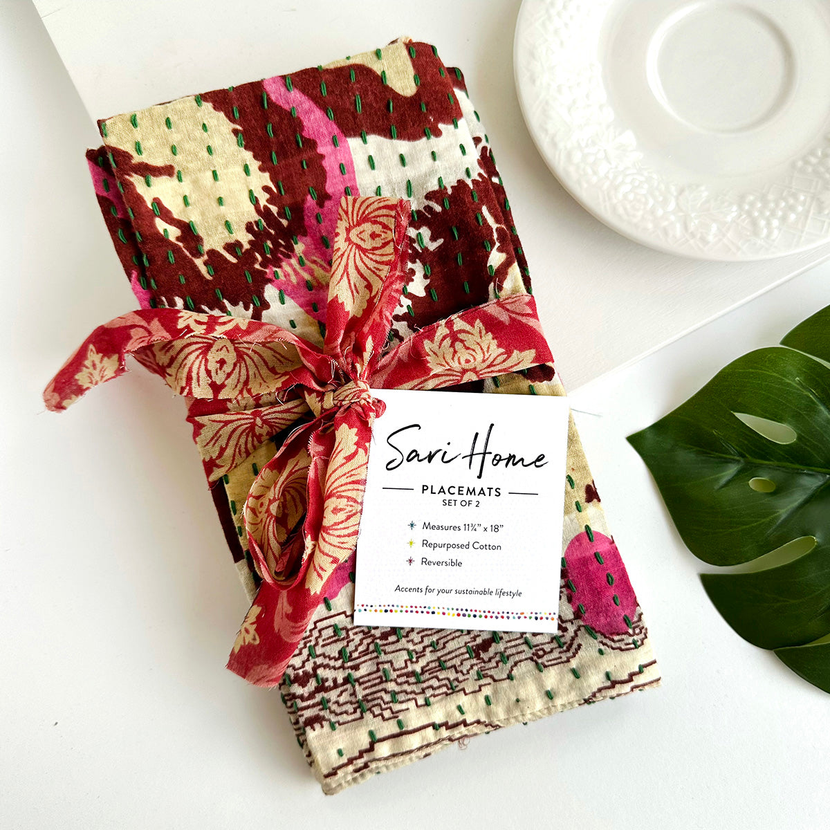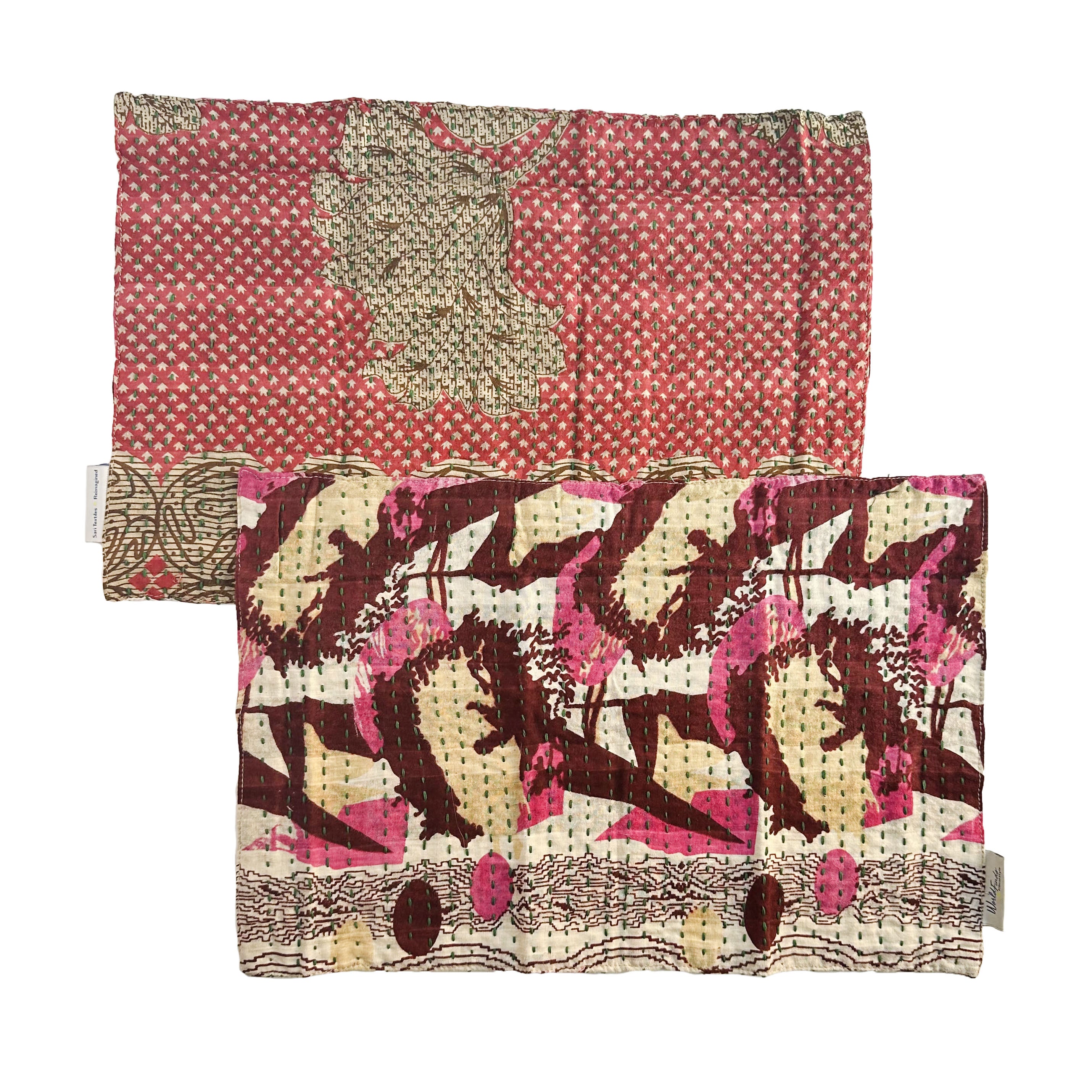 Thoughtfully crafted from repurposed Kantha & Sari textiles; each set is one-of-a-kind with its own colors and patterns.