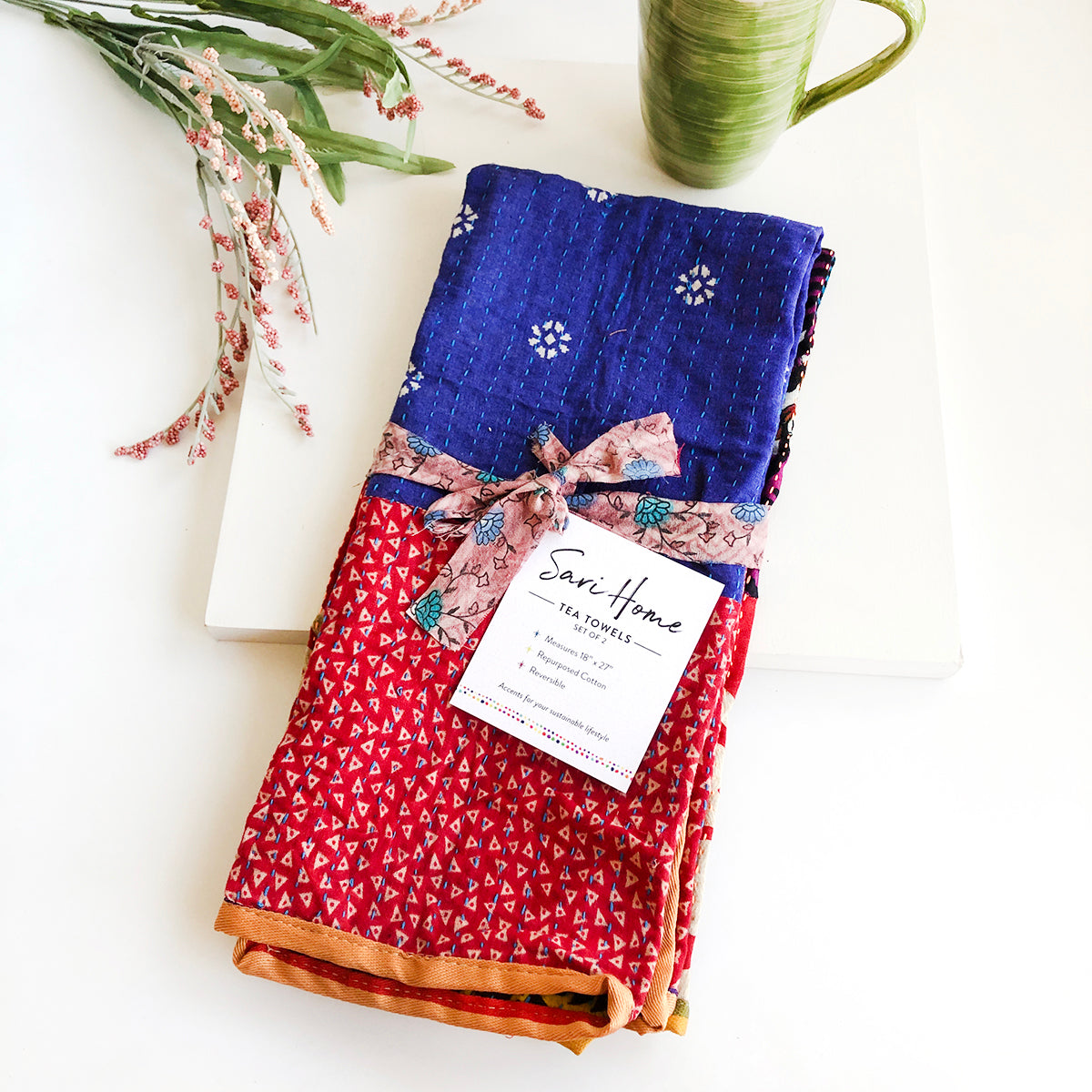 Liven up your kitchen with these unique, handmade Kantha Tea Towels. Featuring one-of-a-kind colors and patterns, each towel is crafted from repurposed Kantha quilts - a single pattern on one side and a patchwork of 3 patterns on the other. Vintage silk sari edging adds the perfect finishing touch.