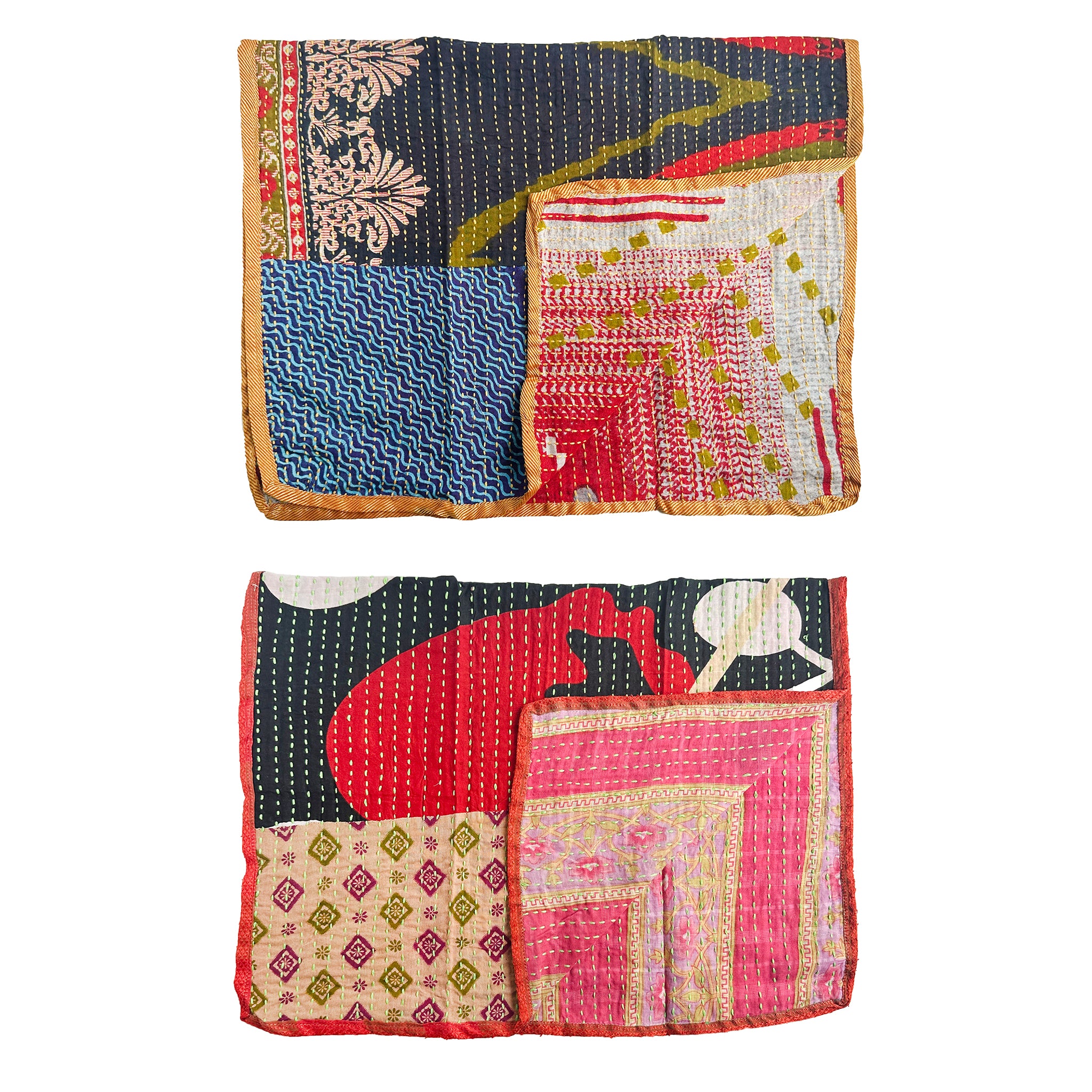 Liven up your kitchen with these unique, handmade Kantha Tea Towels. Featuring one-of-a-kind colors and patterns, each towel is crafted from repurposed Kantha quilts - a single pattern on one side and a patchwork of 3 patterns on the other. Vintage silk sari edging adds the perfect finishing touch.