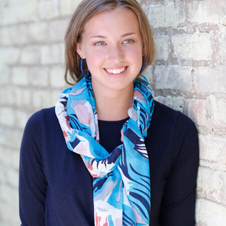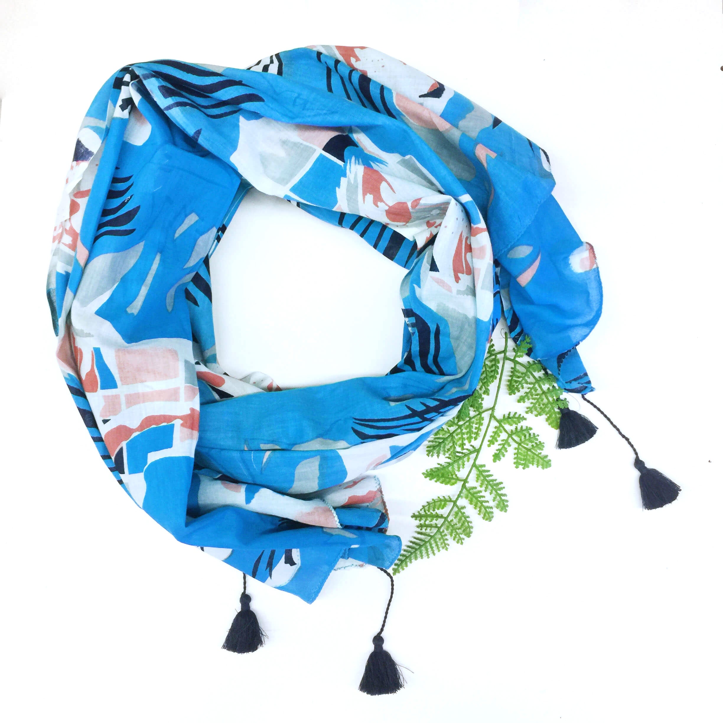 A dynamic interplay of colors, shapes, and patterns come together in this lively bright blue scarf. Artists hand screen print the designs on woven cotton, and embellish the corners with cotton thread tassels.