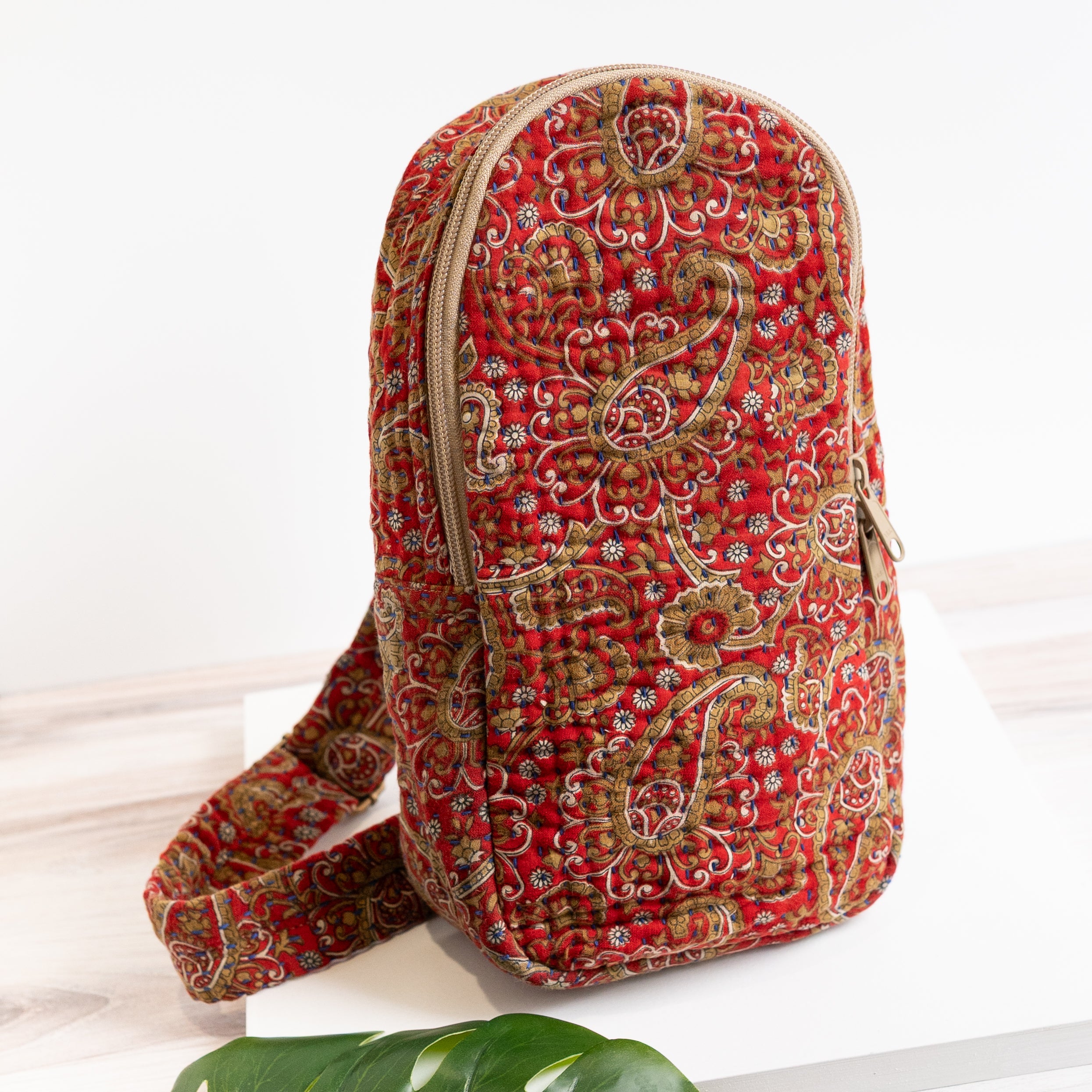 This vibrant Sling Bag offers ample space in its main compartment, plus an internal pocket for extra organization. The bag's interior contains a neutral tan lining with one pocket, while the adjustable strap allows for front or back wear.