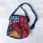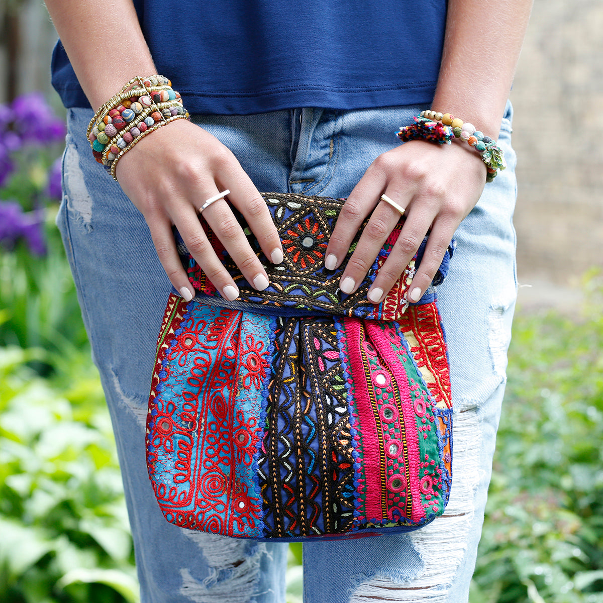 Textured Ikat fabric is paired with repurposed Kutch textiles for a fresh look. Each piece is made from hand-selected Kutch textiles, so colors and patterns are all one-of-a-kind and will vary. Finished with a magnetic closure.