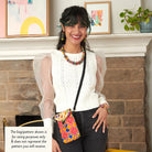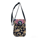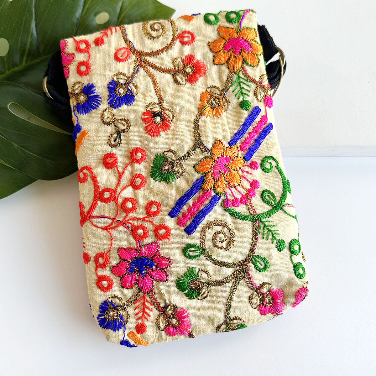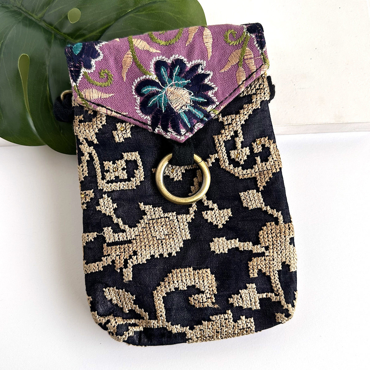 Upcycled Kutch fabrics, skillfully are hand-picked and sewn to create this vibrant, tactile bag. The inside is lined with a black, cotton fabric. The flap is secured with a snap closure and enhanced with a brass ring detail. The strap is made from canvas so it's both durable and comfortable.