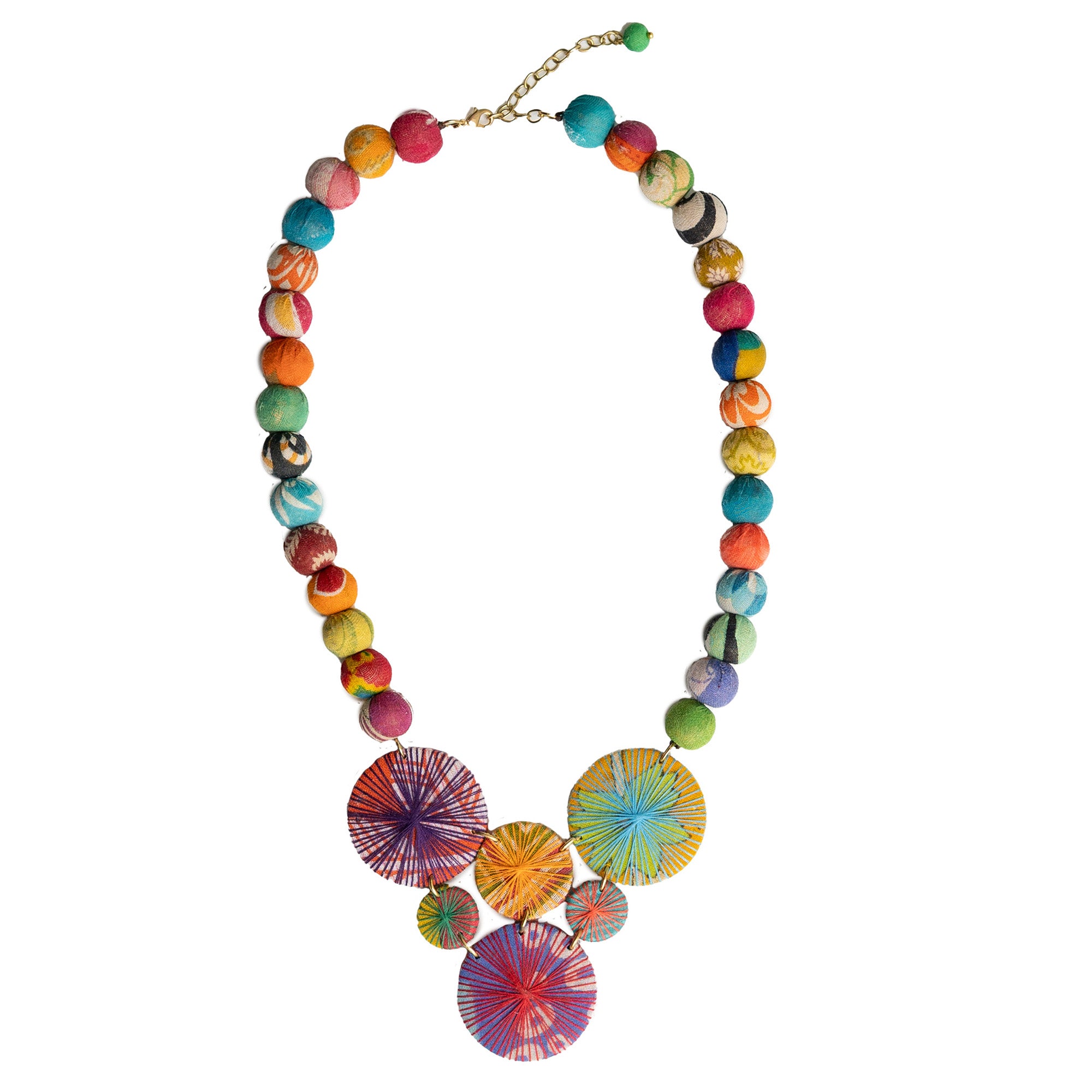 The Kantha Threadburst Collection features a new, fresh technique for our Kantha Jewelry! Artisans embellish Kantha covered disc-shaped beads with burst-like threadwork to create beautifully textured statement beads. These large, medium and small discs are then artfully arranged into a V-shape to form the focal point of the Threadburst Necklace. Traditional round Kantha beads make up the necklace chain.