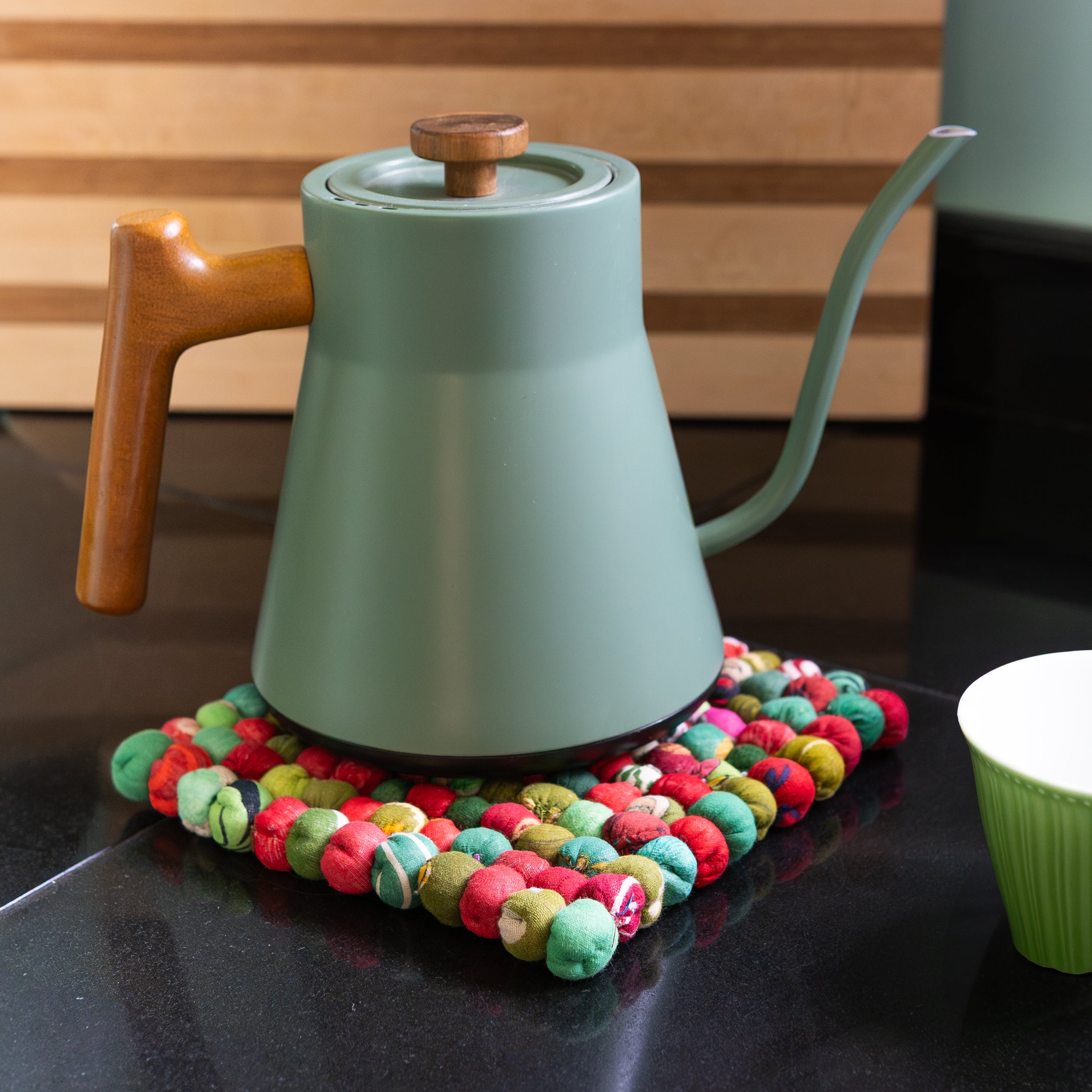 Your favorite trivet is now available in a new colorway! The Sari Home Holiday Trivet will add a festive touch to your home while protecting your surfaces. And it’s the perfect accent for your sustainable lifestyle! Each is handmade from repurposed Sari textiles that have been sorted by color, crafted into balls, filled with soft cotton, and connected with sturdy thread. The Holiday Trivet is crafted with a mix of red and green fabrics.