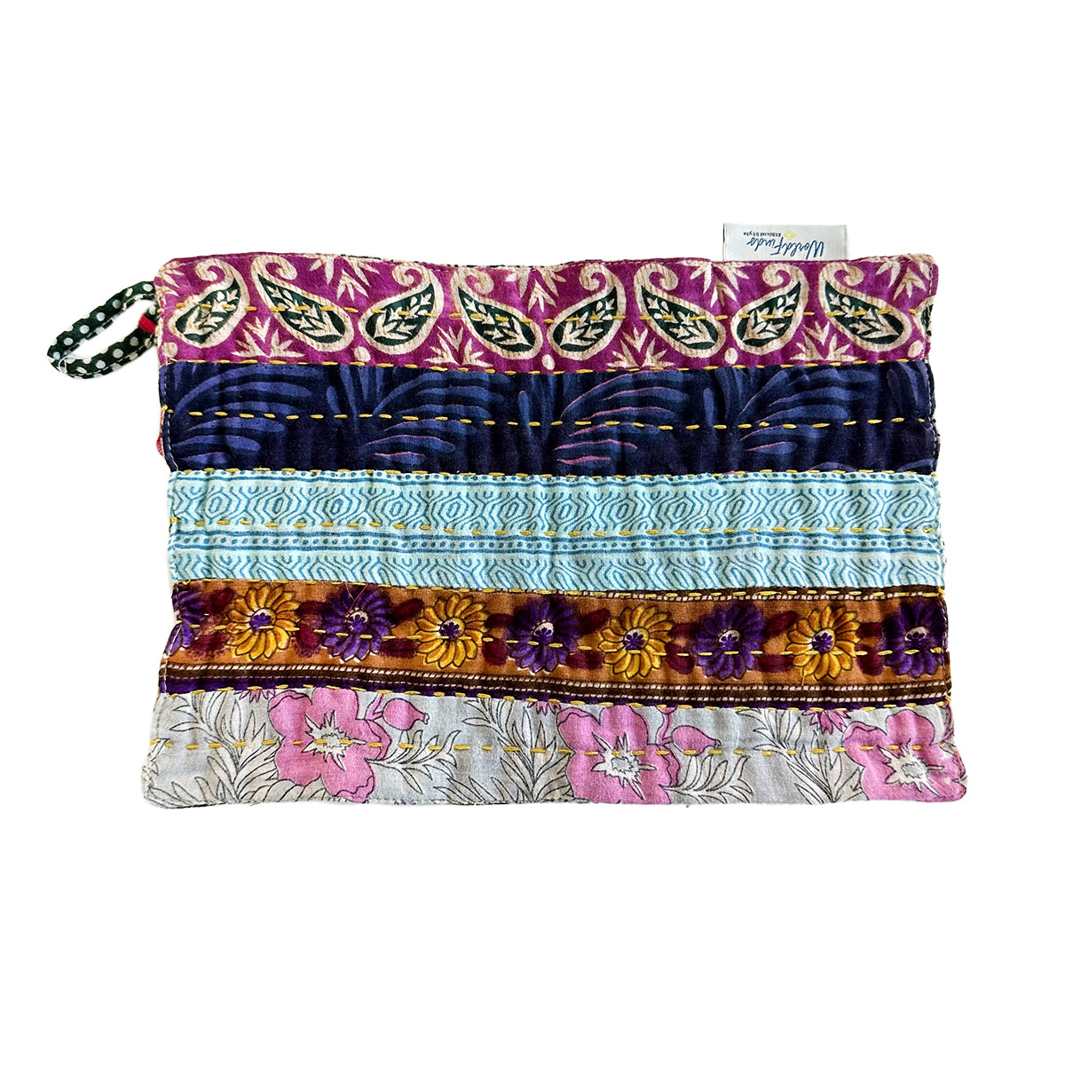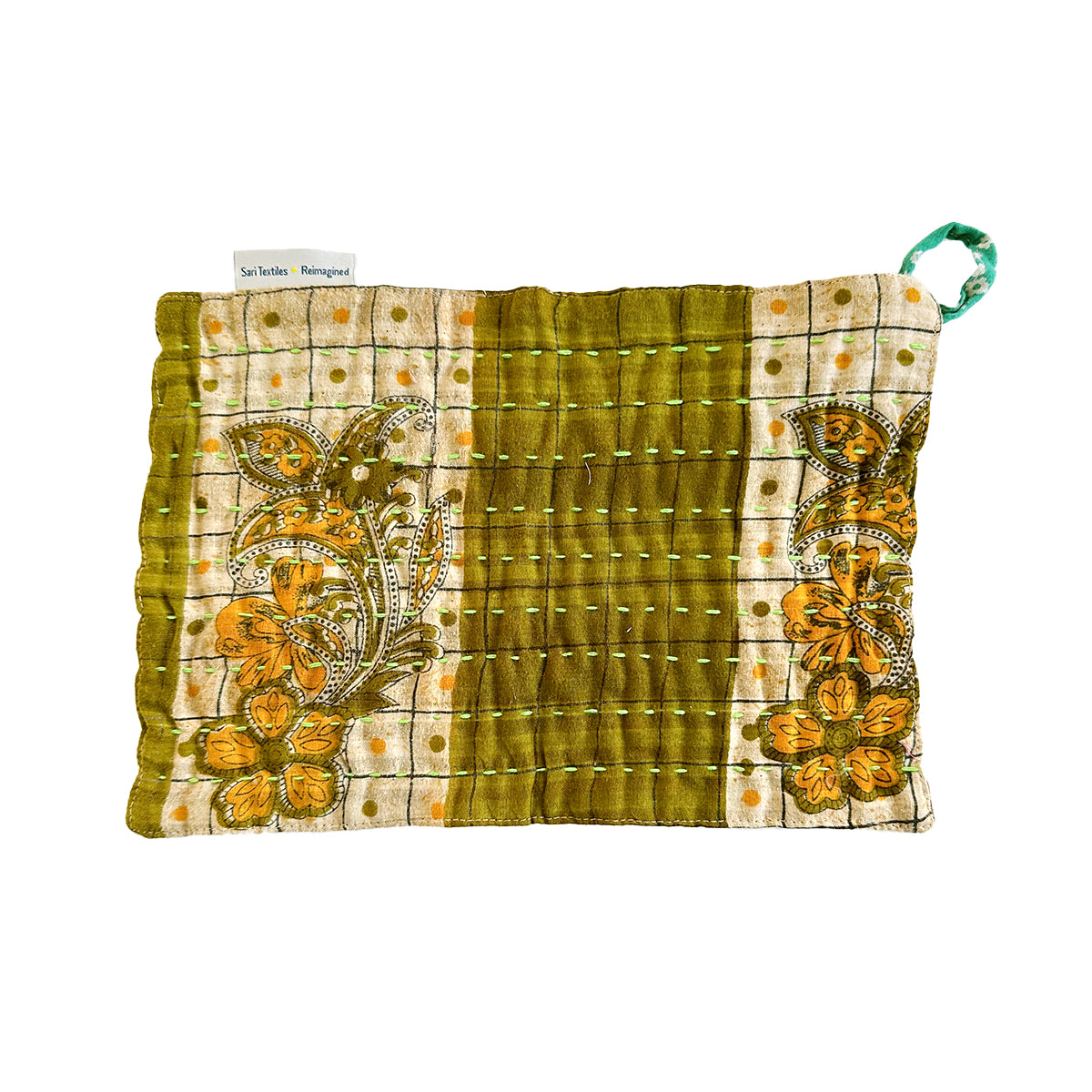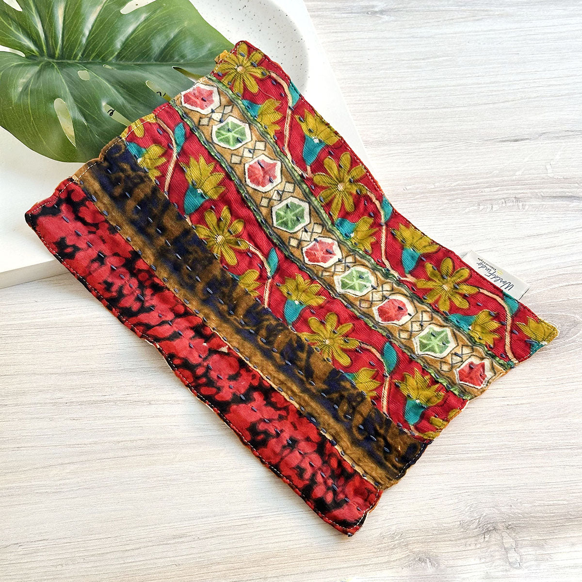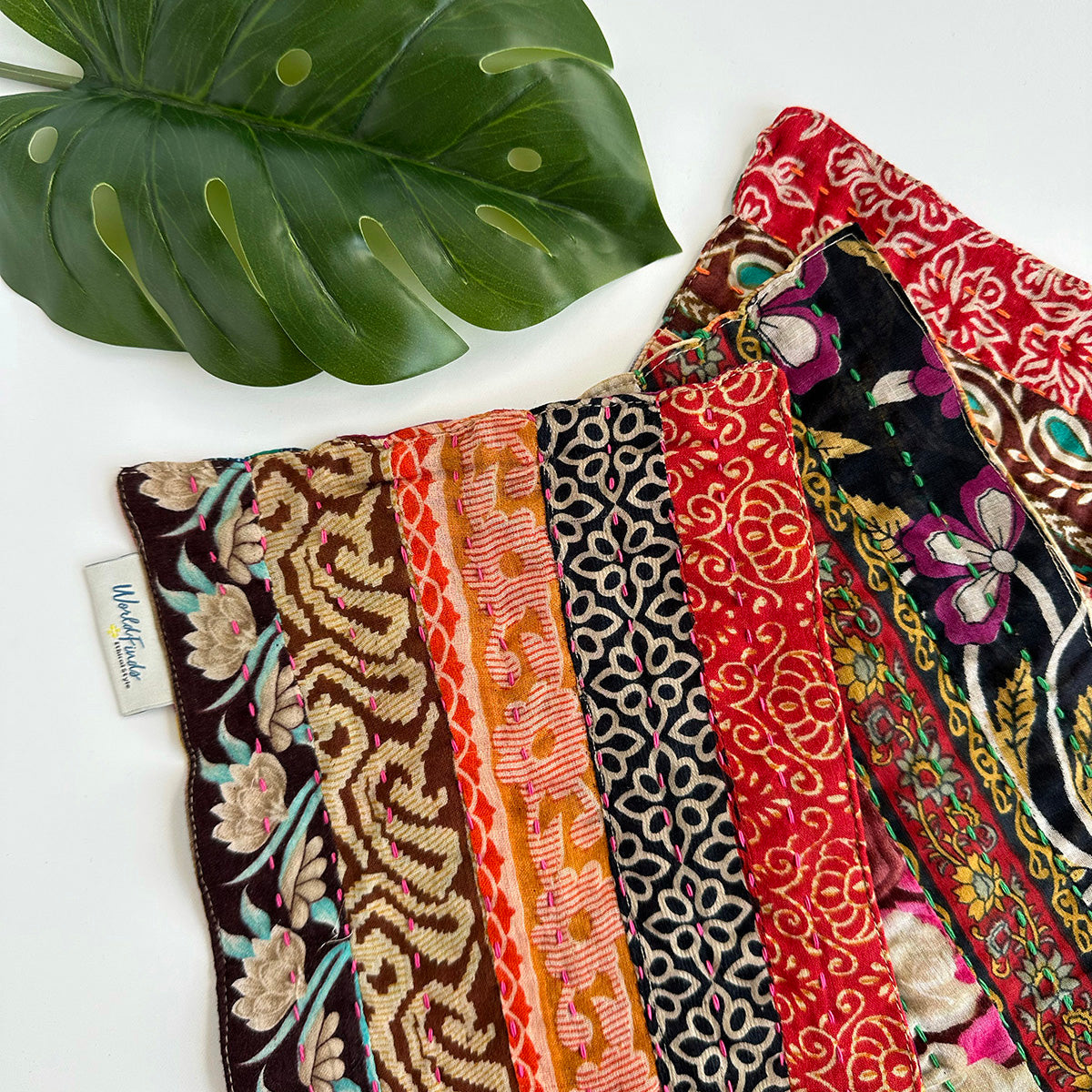 Crafted from recycled Sari and Kantha textiles, the Multi-Use Cloth features a loop for hooking it onto a cupboard knob or hook. This unique item boasts a patchwork of repurposed fabrics on the front, plus a single fabric on the back. Ready, set, clean up spills, wipe down surfaces, and dry off dishes – all without whipping out single-use paper towels. Each cloth is one-of-a-kind with its own colors and patterns.