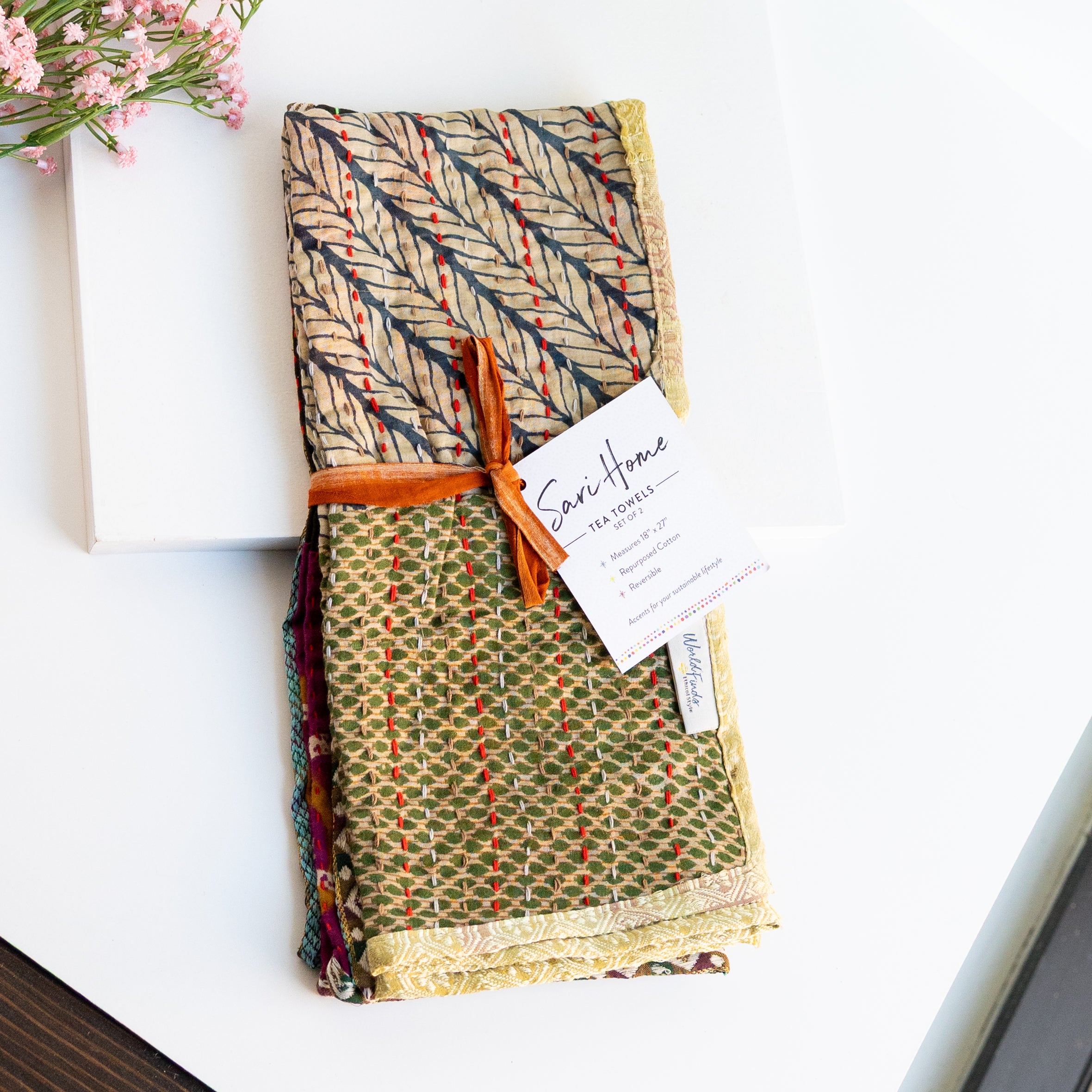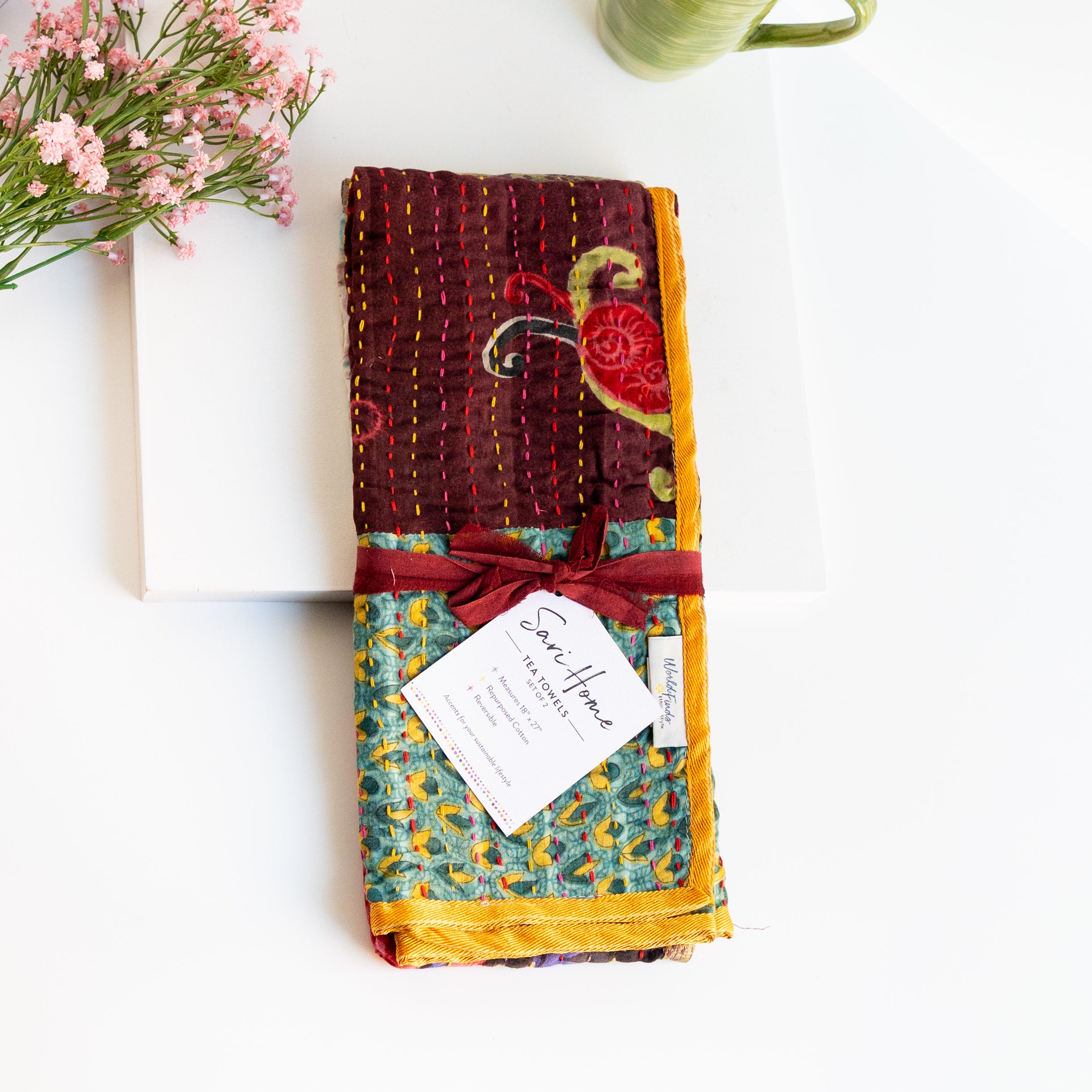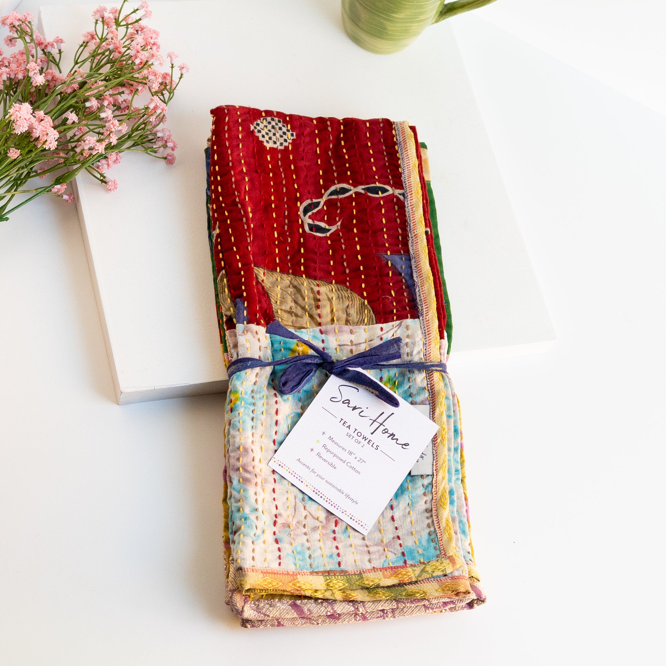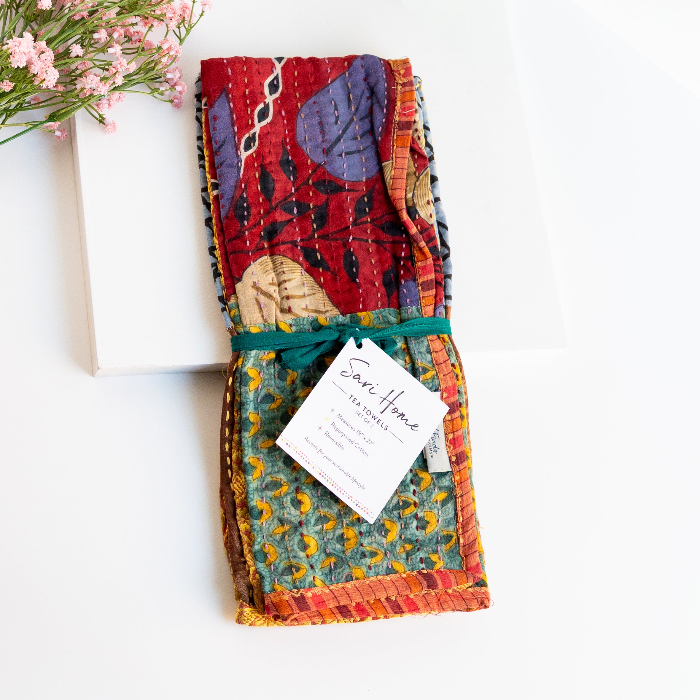 Liven up your kitchen with these unique, handmade Kantha Tea Towels. Featuring one-of-a-kind colors and patterns, each towel is crafted from repurposed Kantha quilts - a single pattern on one side and a patchwork of 3 patterns on the other. Contrast edging adds the perfect finishing touch.