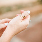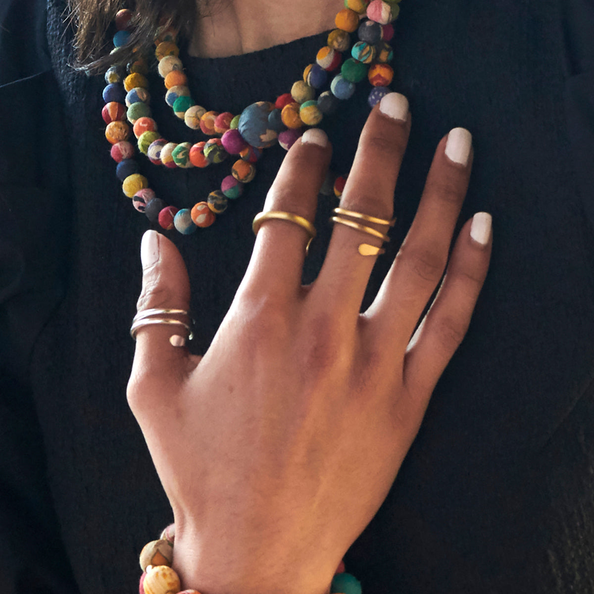 A brushed, matte metal ring coils around and is accented with flattened ends to form this playful style.